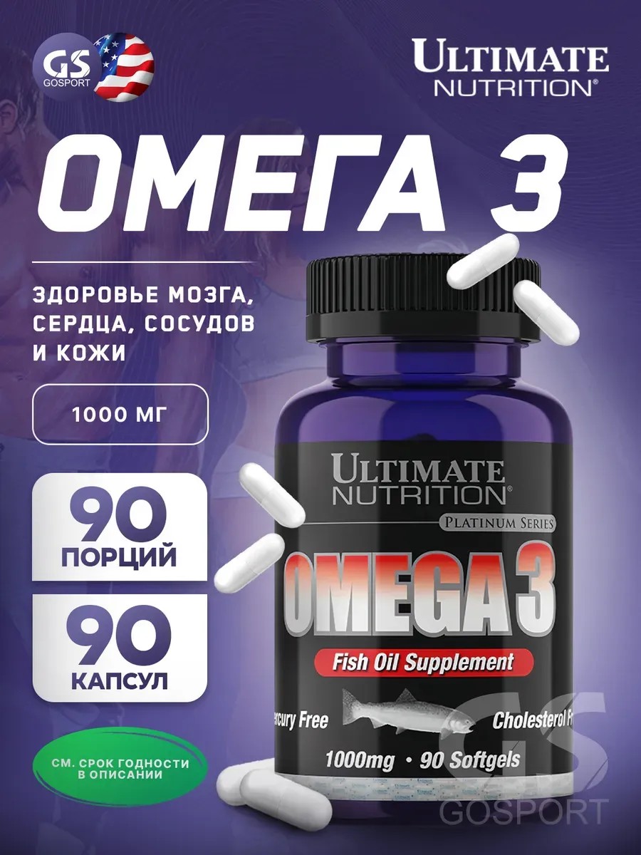 Рыбий жир Ultimate Nutrition Omega 3 1000mg 90 капсул.Использование добавок с рыбьим жиром рекомендуется, поскольку получить достаточное количество омега-3 жиров с длинной цепью очень сложно, даже на рыбной диете. Рыбий жир понижает уровень холестерина, препятствует воспалительным процессам, полезен для сердца и кровообращения в организме. Кроме того, рыбий жир укрепляет иммунную систему, улучшает соотношение LDL/HDL, препятствует депрессии, помогает в борьбе с аллергией, даже используется при лечении некоторых видов рака. Из других полезных свойств, следует отметить способность рыбьего жира понижать давление, замедлять свертываемость крови, предупреждать диабет второго типа в сочетании с другими препаратами.EPA и DHA очень важны для нормального развития и функционирования головного мозга, нервной системы и зрения. Большинство омега-3 исследований фокусируют свое внимание на положительном воздействии этих кислот на здоровье сердца.Регулярное употребление добавок на основе рыбьего жира — это важный шаг к улучшению своего здоровья. Рыбий жир содержит самое большое количество лучших омега-3 жиров вместе с EPA и DHA.Количество питательных веществ в одной гелевой капсуле:Калории – 10Всего жиров – 1 гРыбий жир – 1000 мгEPA (eicosapentaenoic acid) – 180 мгDHA (docosahexaenoic acid) – 120 мгДругие омега-3 жирные кислоты – 30 мгДругие ингредиенты: желатин, глицерин, очищенная вода.Рекомендации по применению: Принимайте 1 капсулу три раза в день вместе с пищей.