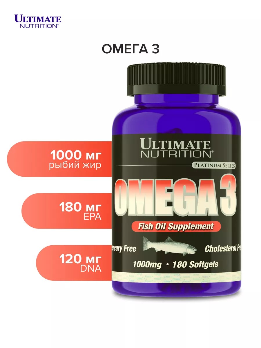 Рыбий жир Ultimate Nutrition Omega 3 1000mg 180 капсул.Использование добавок с рыбьим жиром рекомендуется, поскольку получить достаточное количество омега-3 жиров с длинной цепью очень сложно, даже на рыбной диете. Рыбий жир понижает уровень холестерина, препятствует воспалительным процессам, полезен для сердца и кровообращения в организме. Кроме того, рыбий жир укрепляет иммунную систему, улучшает соотношение LDL/HDL, препятствует депрессии, помогает в борьбе с аллергией, даже используется при лечении некоторых видов рака. Из других полезных свойств, следует отметить способность рыбьего жира понижать давление, замедлять свертываемость крови, предупреждать диабет второго типа в сочетании с другими препаратами.EPA и DHA очень важны для нормального развития и функционирования головного мозга, нервной системы и зрения. Большинство омега-3 исследований фокусируют свое внимание на положительном воздействии этих кислот на здоровье сердца.Регулярное употребление добавок на основе рыбьего жира — это важный шаг к улучшению своего здоровья. Рыбий жир содержит самое большое количество лучших омега-3 жиров вместе с EPA и DHA.Количество питательных веществ в одной гелевой капсуле:Калории – 10Всего жиров – 1 гРыбий жир – 1000 мгEPA (eicosapentaenoic acid) – 180 мгDHA (docosahexaenoic acid) – 120 мгДругие омега-3 жирные кислоты – 30 мгДругие ингредиенты: желатин, глицерин, очищенная вода.Рекомендации по применению: Принимайте 1 капсулу три раза в день вместе с пищей.