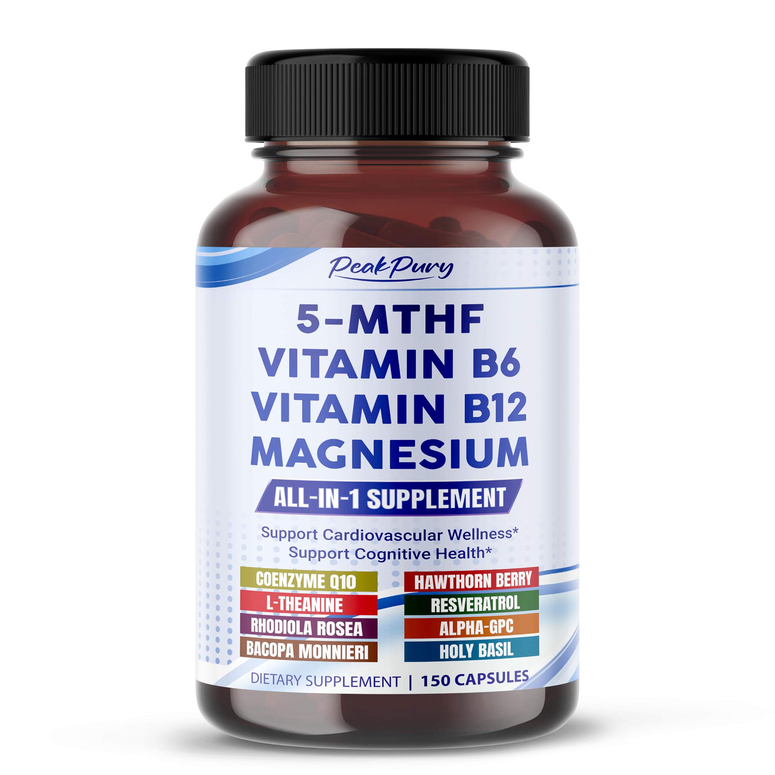 CRAFTED FOR CONSISTENT CLARITY COMFORT: Made in GMP-certified facilities with clean, effective ingredients. Ideal for high-performers who value a focus, calm energy, and mental clarity. LONG-TERM VALUE, ONE DAILY CAPSULE: With 150 capsules per bottle, you get up to 5 months of consistent support. Just one capsule a day delivers daily support—no complex stacks, no interruptions, just simple daily care. TOTAL MOOD MIND SUPPORT IN ONE: Enjoy the synergy of 12 powerful ingredients like Rhodiola, Bacopa, Alpha-GPC, and Holy Basil—all working together to helps promote a positive mindset and mental clarity. SUPPORT A HEALTHIER HEART, NATURALLY: Formulated with 5-Methyltetrahydrofolate (5-MTHF), B6, and B12, this formula supports steady energy and daily vitality, helping you feel resilient throughout the day. STAY BALANCED, THINK CLEAR: Peakpury blend of Magnesium, L-Theanine, Vitamin B6 and Vitamin B12 helps you feel more balanced and mental clarity, so you stay calm, focused, and collected even during busy days.