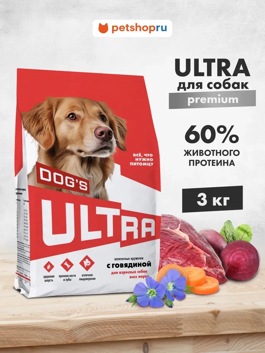 Ultra Сухой корм с говядиной для взрослых собак всех пород, 3кг
