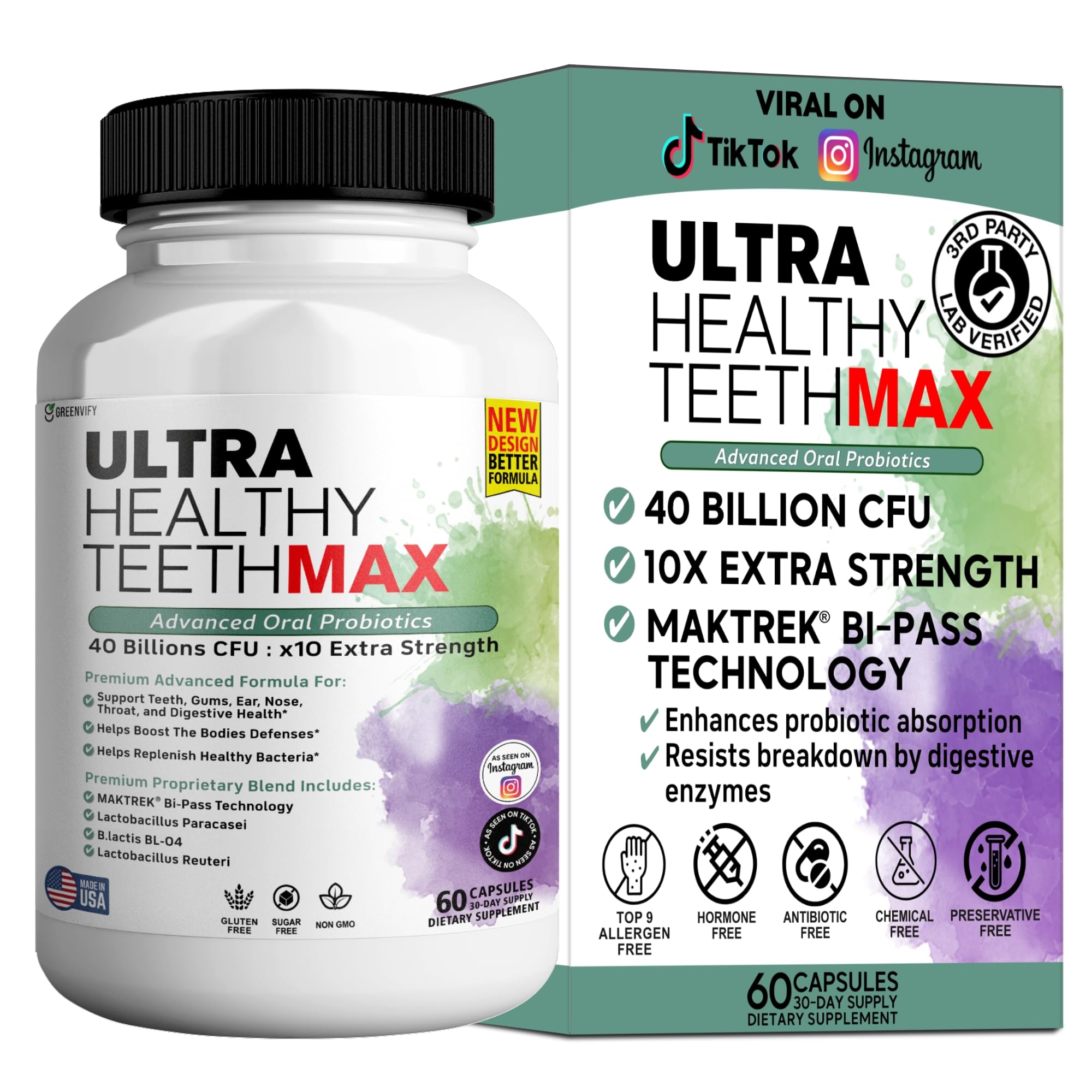 Ultra Healthy Teeth Max – 40 Billion CFU Oral Probiotics Ultra Healthy Teeth Max is a premium probiotic formula designed to support oral, gum, throat, and digestive health. Advanced Oral Care: Supports teeth, gums, ear, nose, throat, and digestive health. High-Potency Probiotics: 40 Billion CFU with Lactobacillus and Bifidobacterium strains. Immune System Boost: Helps replenish healthy bacteria to strengthen the body's natural defenses. MAKTREK Bi-Pass Technology: Ensures probiotics survive stomach acid for maximum absorption. Made in the USA: Gluten-free, sugar-free, non-GMO, and formulated for daily use. Take two capsules daily with water or as directed by your healthcare professional.