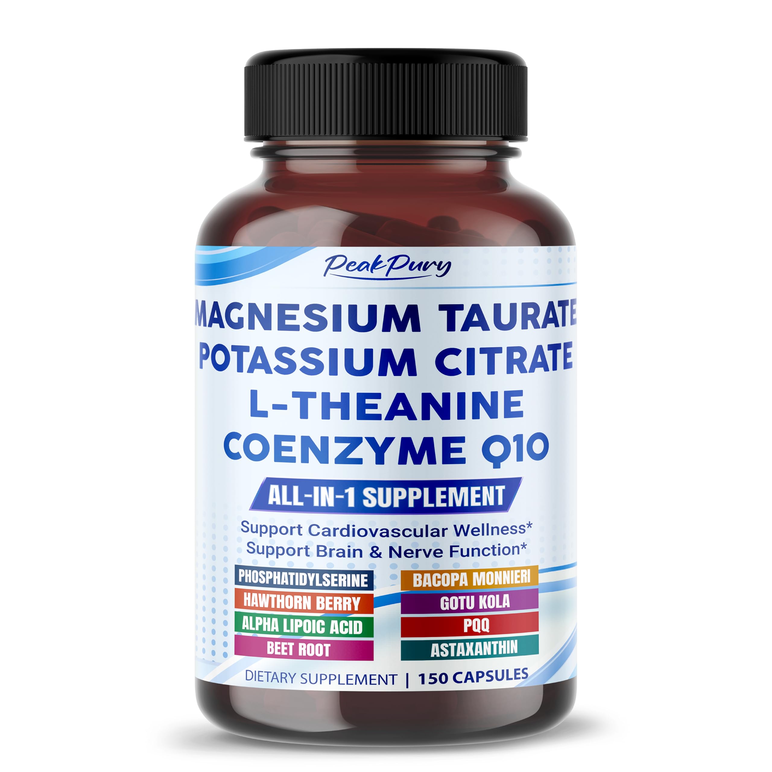 Ultra Magnesium Taurate Potassium Citrate L-Theanine & CoQ10 All-in-1 Supplement for Heart Brain & Nerve Support 150 Capsules 150 count (pack of 1)