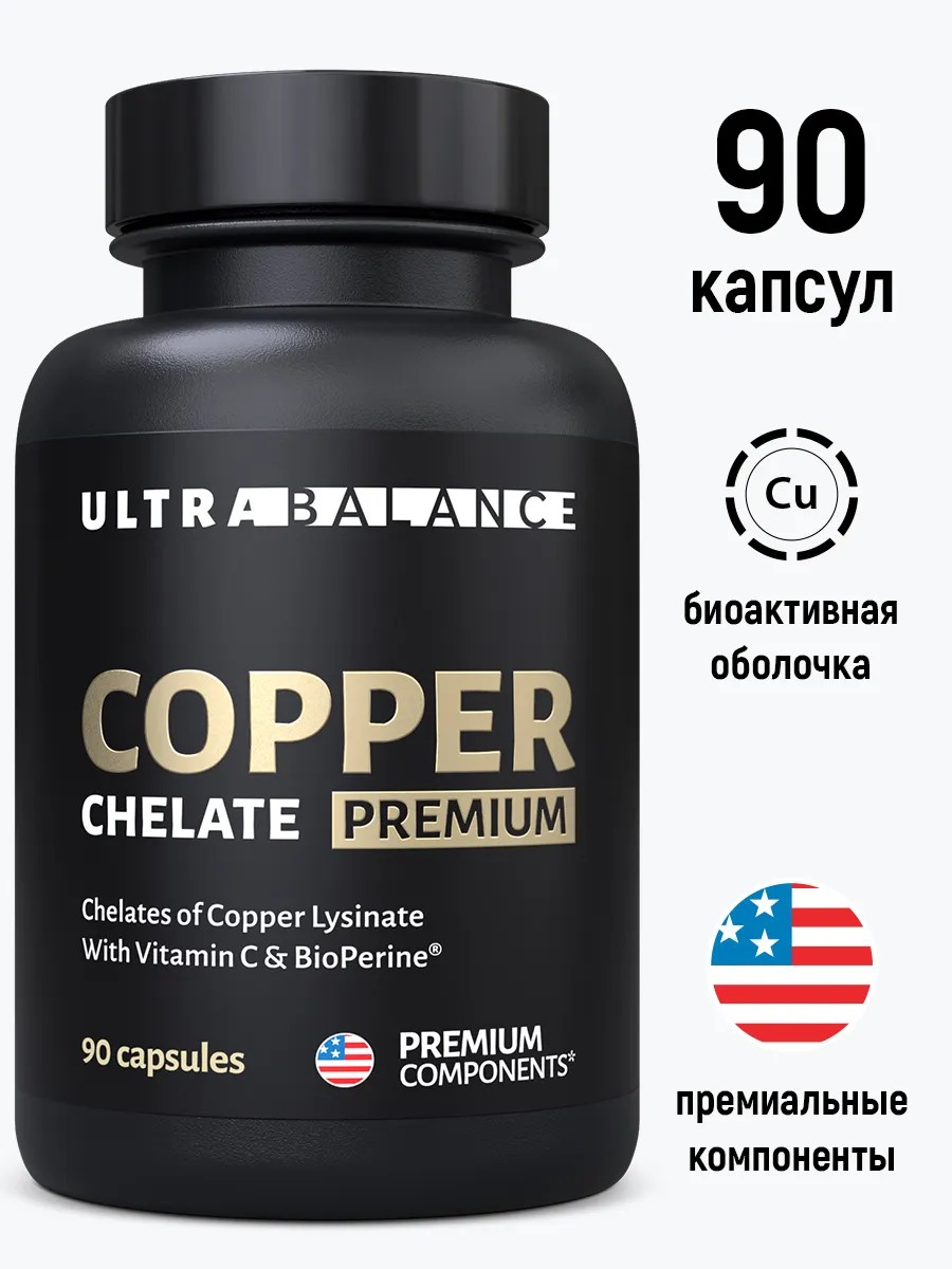 Copper Chelate Premium от UltraBalance — это хелат меди в современной легкоусвояемой форме с аминокислотой лизин, некислотной формой витамина C и запатентованным экстрактом чёрного перца BioPerine. Производство сертифицировано по международным стандартам GMP и ISO 22000.