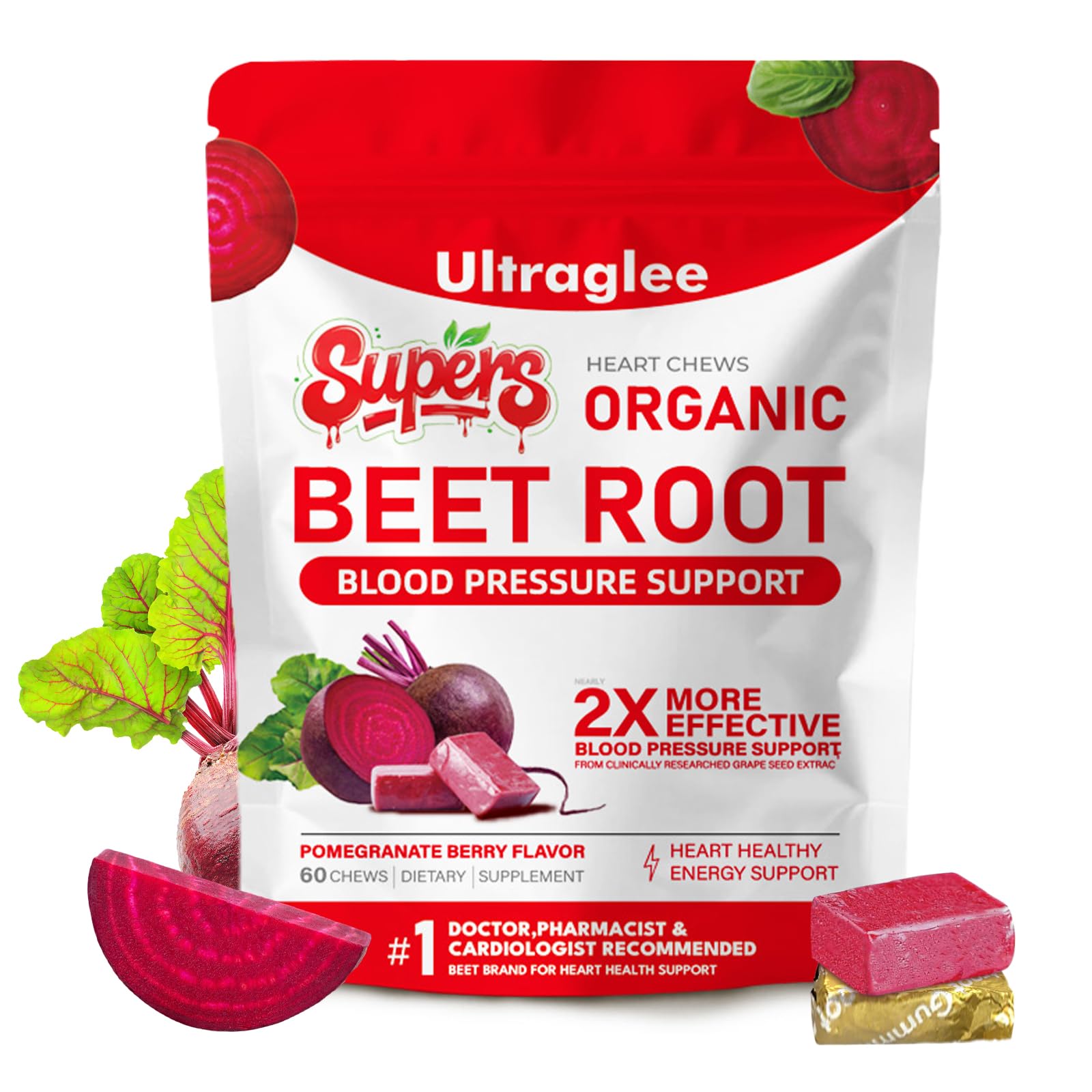 CLINICALLY RESEARCHED INGREDIENTS: Each serving delivers 150mg of French Grape Seed Extract from the Loire Valley and 500mg of USA-grown beetroot powder Beetsroot chewables for antioxidant support and heart health support. EASY TO TAKE: These guilt-free, individually wrapped Total Beets soft chews are portable and fun to eat, with no need to mix into water. Just unwrap, chew, and enjoy a clear boost of heart-healthy energy whenever and wherever your day takes you. pomegranate berry flavored, Beetsroot chews soft chews are for busy lifestyles, providing heart health supplements support anytime, anywhere. AMAZING TASTE: Beets are polarizing. Some people love the taste, some people hate it. Beetsroot Heart chews taste amazing, with a delicious açaí berry flavor that masks virtually all of the raw beet notes. And better yet, no juicing required. PLANT-BASED NON-GMO: Made with plant-based, non-GMO ingredients,Beetsroot Heart Chews may help support nitric oxide levels and cardiovascular health with clinically studied polyphenols and beet root powder beets supplements. HEART-HEALTHY ENERGY: Beetsroot Heart Chews are powered by clinically studied Grape Seed Extract to support healthy blood pressure. These Nitric Oxide supporting supplements for men and women may help support healthy circulation.Product Note: Exposure to heat or sunlight may lead to melting damage of product. Hence customers are expected to be available during the product delivery.