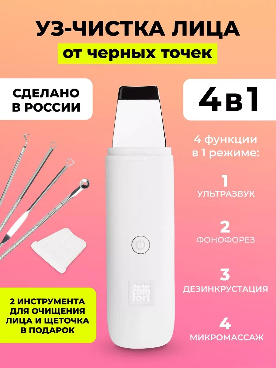Ультразвуковая чистка лица от черных точек и от прыщей Doctor Comfort US-1RU объединила в себе передовые разработки косметологии. Уз чистка Doctor Comfort отлично зарекомендовала себя в качестве косметологического аппарата для комплексного ухода за кожей любого типа. А благодаря уникальной повышенной частоте ультразвука аппарат для ультразвуковой чистки лица Doctor Comfort обладает высокой эффективностью и активно применяется в профессиональной косметологии в качестве комплексного и безопасного ухода для лица. Doctor Comfort US-1RU портативна, удобно лежит в руке, обладает идеальной эргономикой и простотой эксплуатации. Аппарат для ультрозвуковой чистки глубоко очищает, тонизирует и укрепляет кожу, улучшает цвет, усиливает проникновение профессиональной косметики, позволяет эффективно проводить процедуру очищения кожи: удаления ороговевших клеток эпидермиса, комедонов, угрей, черных точек, уменьшения количества кожного себума, с одновременным увлажнением и обогащением кислородом поверхностных слоев кожи. Ультразвуковой инструмент справляется с несовершенствами и признаками старения, способствует подтяжке лица и омоложению, предупреждает появление морщин, отеков и акне, служит для выдавливания прыщей. Уз аппарат не вызывает аллергии и раздражения, как косметика или умывалка, не подходящая по типу кожи, а также не доставляет дискомфорта при использовании таких средств, как пластырь против черных точек, петля или давилка, выдавливатель для прыщей. С апаратом можно проводить дома такие косметические процедуры, как пилинг и микромассаж ультразвуком, введение косметики или фонофорез, дезинкрустация, которые широко используются в косметологии. Они оказывают лифтинг и пилинг эффект как скраббер, помогают в очистке лица и удалению угрей, постакне, а также сужению и очищению пор. Очищающие пиллинг процедуры предотвращают шелушение, убирают камедоны, причины воспалений, забитые поры, комедоны, шелушение, отеки и 'круги' под глазами, признаки усталости и стресса.