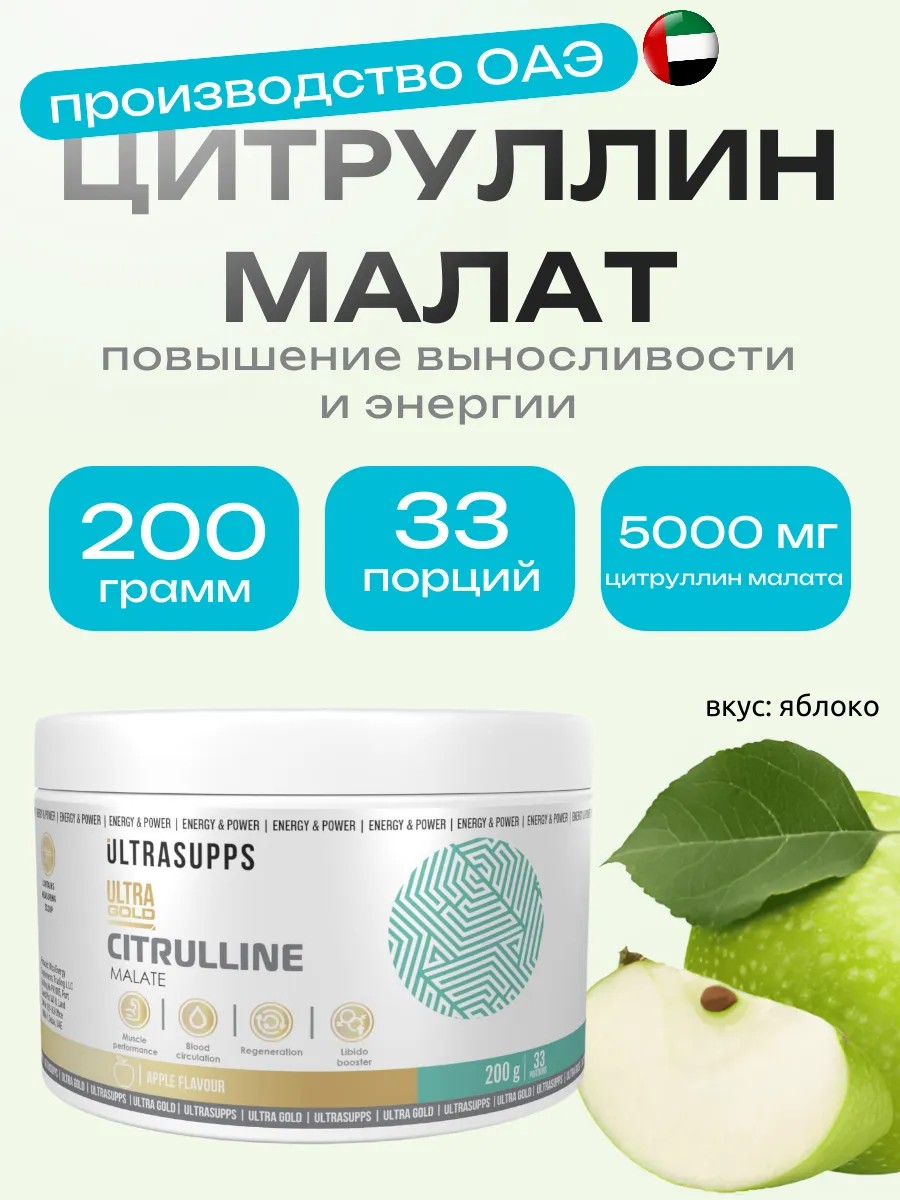 | Комплектация | Ultrasupps Ultra Gold Citruline 200 гр (Яблоко) 1шт в оригинальной упаковке |