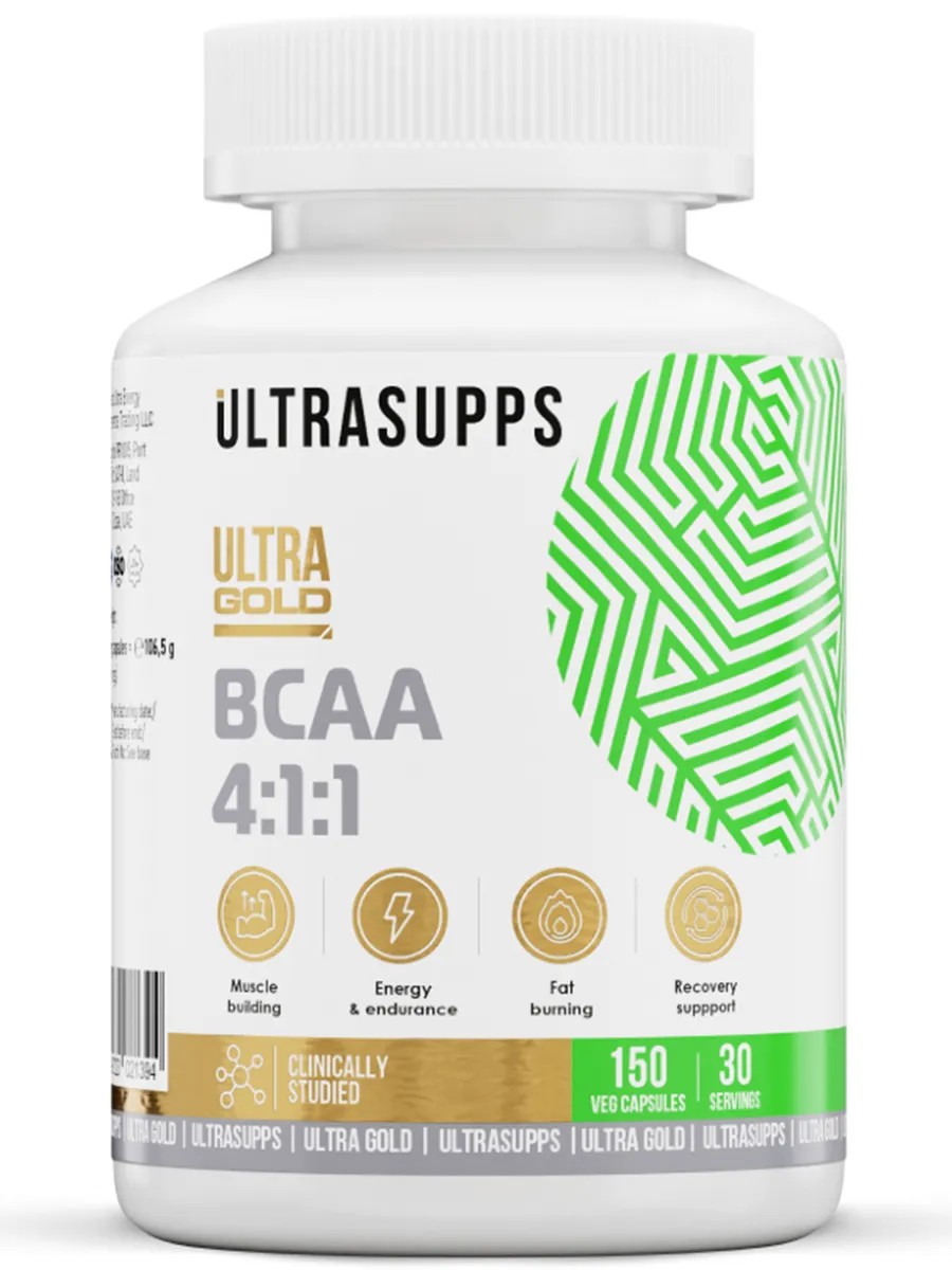 Ultra Gold BCAA 4:1:1 ULTRASUPPS — комплекс аминокислот для ваших лучших спортивных результатов. В состав комплекса входят 3 незаменимые аминокислоты: L-лейцин, L-изолейцин и L-валин в соотношении 4:1:1 для активного роста мышц и быстрого восстановления между тренировками. ВСАА необходимы организму для активного синтеза белка в мышцах и предотвращения его разрушения. Специально подобранный состав добавки ускоряет процесс роста мышечных волокон. Удобная форма продукта позволяет легко принимать его в любое время и в любом месте. Серия спортивных добавок Ultra Gold разработана международным брендом Ultrasupps (ОАЭ) специально для повышения продуктивности тренировок и быстрого восстановления. Продукты подходят как профессиональным спортсменам, так и всем, кто занимается фитнесом. Ultrasupps использует в производстве только лучшее сырье премиального качества. Все компоненты продуктов тщательно протестированы. Полезные свойства: 1. Способствует сжиганию лишнего жира без потери мышечной массы. 2. Насыщает мышцы энергией. 3. Является сырьем для синтеза мышечных волокон. 4. Сокращает интенсивность и продолжительность катаболических процессов. 5. Способствует ускорению восстановления между тренировками. 6. Способствует сохранению мышечной массы при сушке или похудении. 7. Стабилизации уровень сахара в крови и инсулиновый ответ. 8. Помогает организму выводить излишки холестерина и азота. 9. Способствует сбалансированному обмену веществ. Применение: Суточная дозировка BCAA зависит от массы тела и целей применения. Чтобы почувствовать эффект от применения добавки, нужно принимать около 15–30 г в сутки. При этом дозу разделяют на 2–3 приема. Оптимальная разовая доза составляет 4 - 8 г вне зависимости от тренировочной цели. Время приема будет зависеть от цели: наращивание мышечной массы - перед и после тренировки; снижение веса - через 20–30 минут после кардиотренировок, а также в дни отдыха — в дневное и вечернее время до еды. Допустим и прием прямо во время тренировки. Состав в 5 капсулах: Л-Лейцин - 1600 мг, Л-Изолейцин - 400 мг, Л-Валин - 400 мг. Другие ингредиенты: рисовая мука, PVPK30, диоксид кремния, растительный стеарат магния, прозрачная растительная оболочка капсулы. Сеть магазинов для здоровья, спорта и красоты "Атлетик Фуд".