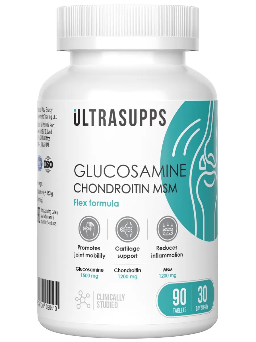 Компоненты, входящие в состав комплекс Glucosamine & Chondroitin & MSM от компании UltraSupps способствуют восстановлению поврежденных соединительных тканей суставов и поддержанию их здоровой подвижности и эластичности. Глюкозамин помогает сохранить хорошее состояние хрящей, хондроитин важен для суставной оболочки и хрящевой ткани, а MSM обладает противовоспалительными свойствами. Преимущества этого комплекса включают: 1. Укрепление и защиту соединительных тканей от травм и растяжений во время физической активности, а также компенсацию возрастных изменений. 2. Уменьшение воспаления и облегчение боли, а также снятие отеков. 3. Нормализацию отложения кальция, что способствует уменьшению хруста суставов. 4. Повышение упругости и прочности связок и сухожилий, а также восстановление поверхности хрящевой ткани. 5. Улучшение подвижности суставов и устранение ограничений в движениях. Рекомендации по применению: 3 таблетки в день в течение 1-2 месяцев. Состав в 3 таблетках: Глюкозамин сульфат - 1500 мг, Хондроитин сульфат - 1200 мг, Метилсульфонилметан (МСМ) - 1200 мг. Ингредиентный состав: глюкозамин сульфат 2KCI (из ракообразных), хондроитин сульфат натрия, метилсульфонилметан (МСМ), антислеживающие агенты (магниевые соли жирных кислот, диоксид кремния). Сеть магазинов для здоровья, спорта и красоты "А-Фуд".