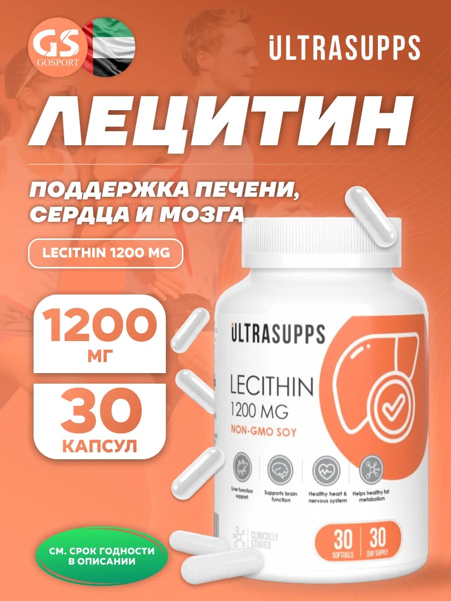 Expires on March 30, 2027. Lecithin 1200 mg 30 capsules. Natural soy lecithin from Ultrasupps is a source of essential phospholipids needed to protect and restore liver cells, maintain healthy nerve fibers, support normal brain function and regulate cholesterol levels. Lecithin is also extremely effective during periods of stress, physical exertion and at a more mature stage of life. The benefits of lecithin from Ultrasupps are: Normalization of metabolism, reduction of "bad" cholesterol and a reduced risk of developing cardiovascular diseases such as atherosclerosis, heart attacks and strokes. Prevention of the formation of cholesterol plaques on the walls of blood vessels. Maintaining healthy liver and kidney function, regulating bile secretion and preventing the formation of gallstones. Stimulates the nervous system, which helps combat neuroses, stress, and depression, and reduces irritability and fatigue. Improves healthy brain function, memory, and increases energy and performance. Helps absorb fat-soluble vitamins A, D, E, and K thanks to the choline content of lecithin. Strengthens the body's antioxidant defenses and slows down the aging process. Indications for use: Used as a dietary supplement - an additional source of lecithin. Recommended use: Take 1-2 capsules daily, whole, with a small amount of liquid. Contraindications: Individual intolerance to the components. It is recommended to consult a doctor before use.