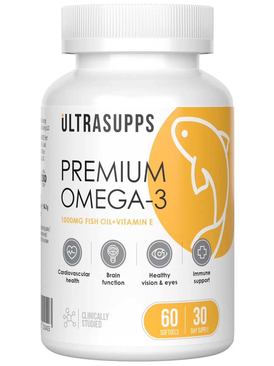 Premium Omega-3 от Ultrasupps эффективно поддерживает здоровье сердечно-сосудистой системы и нормализует уровень холестерина в крови. Витамин Е, входящий в состав продукта, играет роль антиоксиданта и помогает защитить клетки организма от вредного воздействия окислительного стресса. Комплекс был разработан, чтобы удовлетворить потребности организма в незаменимых полиненасыщенных жирных кислотах, которые играют важную роль в поддержании здоровья на протяжении всей жизни, а особенно после достижения возраста 40 лет. Омега-3 - это ключевой и неотъемлемый продукт для каждого человека. Преимущества этого комплекса включают: 1. Регулирование работы сердца и защиту сердечно-сосудистой системы. 2. Помощь в снижении уровня вредного холестерина и поддержание здорового кровяного давления. 3. Поддержание остроты зрения, здоровой работы мозга и укрепление иммунитета. 4. Повышение эффективности и рабочей способности. 5. Улучшение настроения, качества сна и снижение риска депрессии. Рекомендации по применению: 1-2 капсулы во время еды. Продолжительность приема 1 месяц. Состав в 1 капсуле: Рыбий жир - 1000 мг, Всего Омега-3 - 550 мг (EPA (Эйкозапентаеновая кислота) - 330 мг, DHA (Докозагексаеновая кислота) - 220 мг), Витамин Е - 2 мг. Ингредиентный состав: концентрат рыбьего жира (70.4%), мягкая желатиновая капсула (желатин, глицерин, вода), покрытие (шеллак, лецитин, триглицерид средней цепи, альгинат натрия, стеариновая кислота), витамин Е (как d-альфа-токоферол). Сеть магазинов для здоровья, спорта и красоты "А-Фуд".