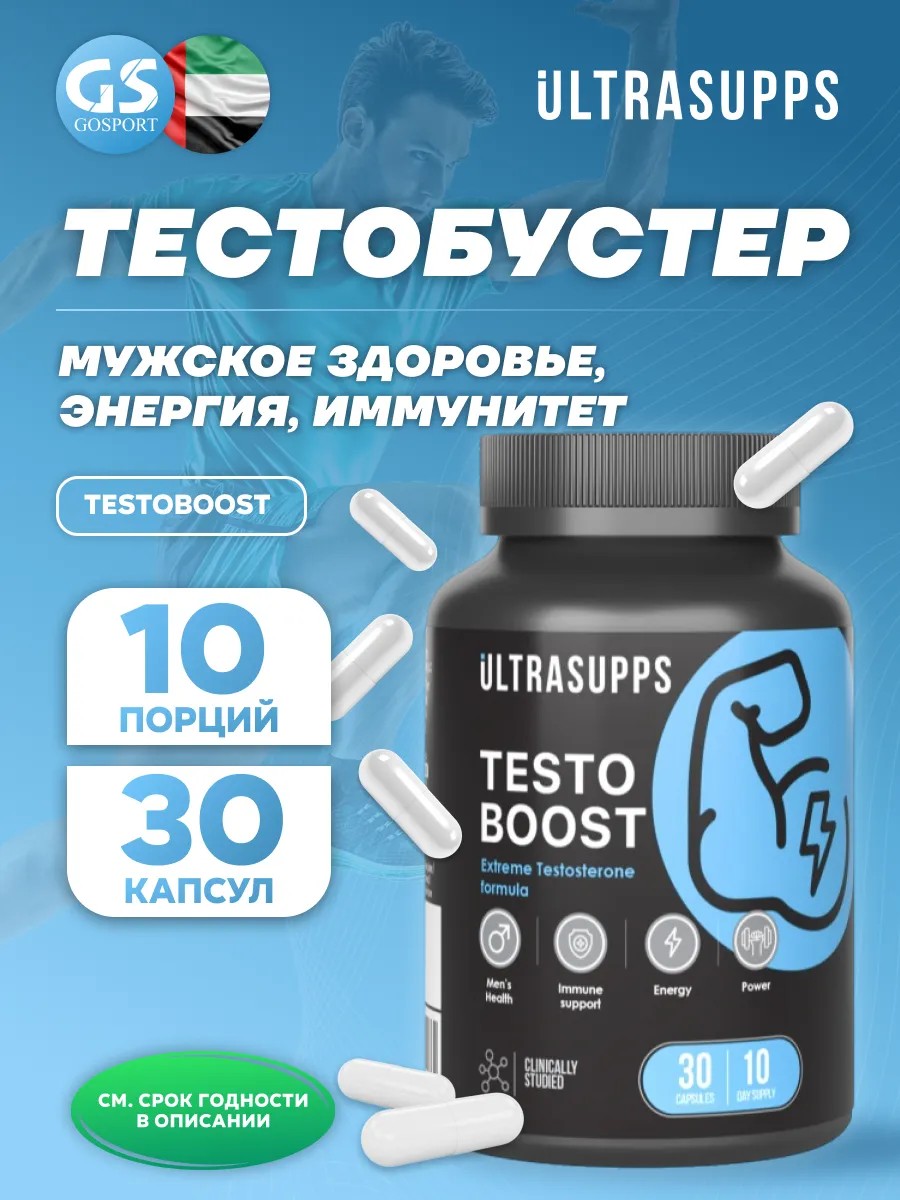 Годен до 30.04.2026. Тестобустеры Testoboost 30 капсул. Тестостерон - это ключевой гормон, отвечающий за множество аспектов здоровья и физической активности, таких как сила, скорость мышления и реакции, мышечный тонус, активность в спорте, высокое либидо и общее хорошее настроение, как у мужчин, так и у женщин. С возрастом производство этого гормона снижается, поэтому очень важно поддерживать его уровень с помощью специальных препаратов.Testoboost от Ultrasupps способствует повышению уровня тестостерона в организме, не содержит синтетических гормонов или запрещенных веществ, и при этом разрешен для занятий спортом. Он наиболее эффективен для мужчин в возрасте 35-50 лет, которые могут замечать постепенное снижение уровня тестостерона. А у женщин, занимающихся активным спортом, прием этой добавки может спровоцировать увеличение силы и стимулировать рост мышц.Testoboost содержит:- Натуральные растительные вещества, такие как корень маки перуанской и корень дикого ямса.- Цитрат цинка, поддерживающий уровень свободного тестостерона и положительно влияющий на иммунитет.Testoboost эффективен для:- Поддержания естественного уровня тестостерона в организме;- Увеличения результативности тренировок, повышения выносливости и мышечной силы, быстрого восстановления после нагрузок;- Уменьшения жировых отложений и увеличения мышечной массы;- Повышения скорости мышления, концентрации внимания и общей работоспособности.Также продукт вызывает прилив сил и хорошего настроения, увеличивает либидо, способствует поддержанию здоровой сексуальной активности и положительно действует на нервную систему и иммунитет.Показания: Применяют в качестве биодобавки к пище в качестве дополнительного источника тестостерона.Рекомендации по применениюПо 1 капсуле 1-3 раза в день до еды, запивая достаточным количеством жидкости.Противопоказания: Индивидуальная непереносимость компонентов, беременность и кормление грудью. Перед применением рекомендуется проконсультироваться с врачом.