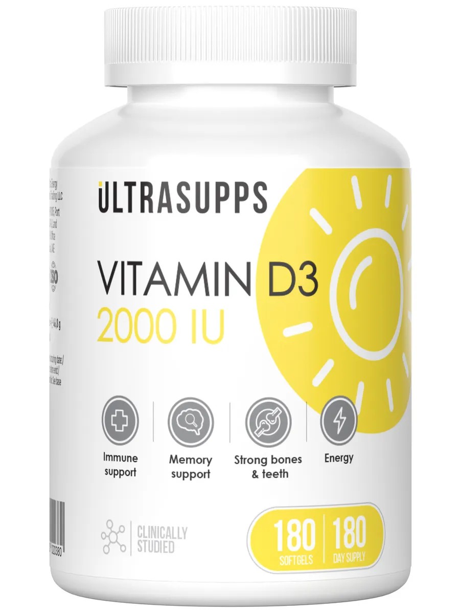 Витамин D3 является ключевым элементом как для детей, так и для взрослых, необходимым организму начиная с внутриутробного развития и на протяжении всей жизни. Из-за различий в климате и недостаточного воздействия солнечного света, множество людей не получает достаточного количества этого витамина и требует его дополнительного введения. Витамин D3 играет важную роль в поддержании здоровья мозга, костей, сердечно-сосудистой, нервной и гормональной систем. Vitamin D3 2000 IU Ultrasupps: 1. Повышает физическую выносливость, уровень энергии и бодрости и борется с хронической усталостью. 2. Способствует развитию памяти и повышению концентрации внимания. 3. Улучшает настроение и общее самочувствие, предотвращает наступление депрессии. 4. Укрепляет кости и зубы, помогает усвоению кальция и фосфора, снижает риска остеопороза, снимает боли в суставах и судороги, вызванные дефицитом витамина D3. 5. Способствует улучшению здоровья сердца и сосудов. 6. Поддерживает репродуктивную функции как у женщин, так и у мужчин. 7. Защищает иммунную системы, помогает в борьбе с инфекциями и воспалительными процессами. Принимать по 1-2 капсуле в день, запивая водой. Состав в 1 капсуле: Витамин Д3 (как Холекальциферол) - 50 мкг (2000 IU). Другие ингредиенты: подсолнечное масло, мягкая желатиновая капсула (желатин, глицерин, вода), витамин Д3 (холекальциферол). Сеть магазинов для здоровья, спорта и красоты "Атлетик Фуд".
