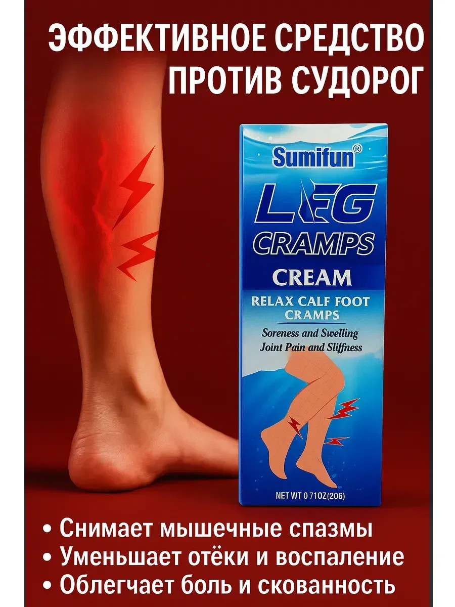 Крем от судорог в ногах Sumifun — эффективное средство для снятия мышечных спазмов, боли и отёков. Формула разработана для комплексного ухода за ногами, помогает расслабить икроножные мышцы, уменьшить воспаление и восстановить комфорт после нагрузок или ночных судорог.