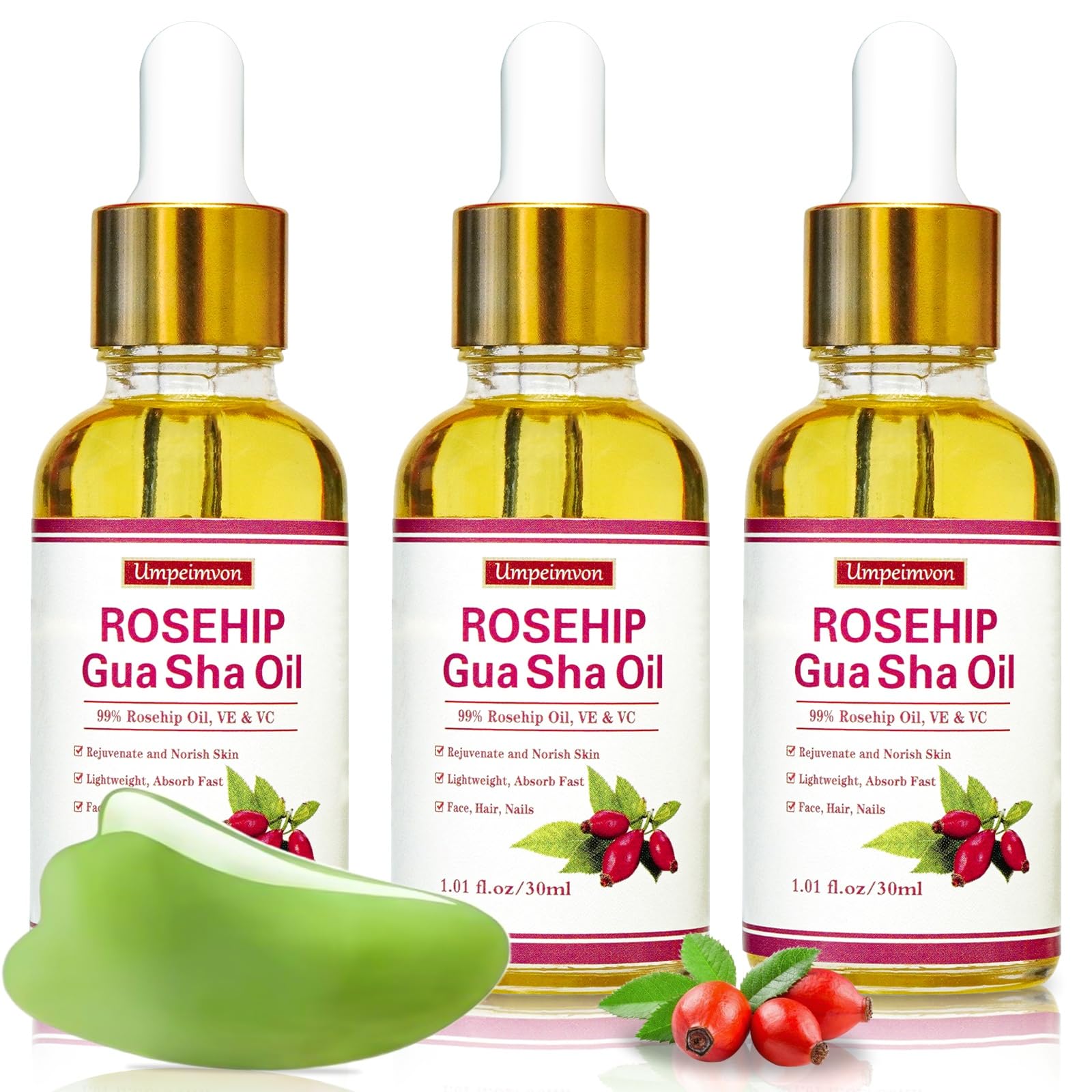 Umpeimvon 3 Pack Gua Sha Face Oil for Women Rosehip Oil Organic Facial Oil Moisturizer Infused Rose Vitamin E & C Restore and Rejuvenate Hydrating Facial Oil for Dermaplaning 1.01fl.oz/30ml
