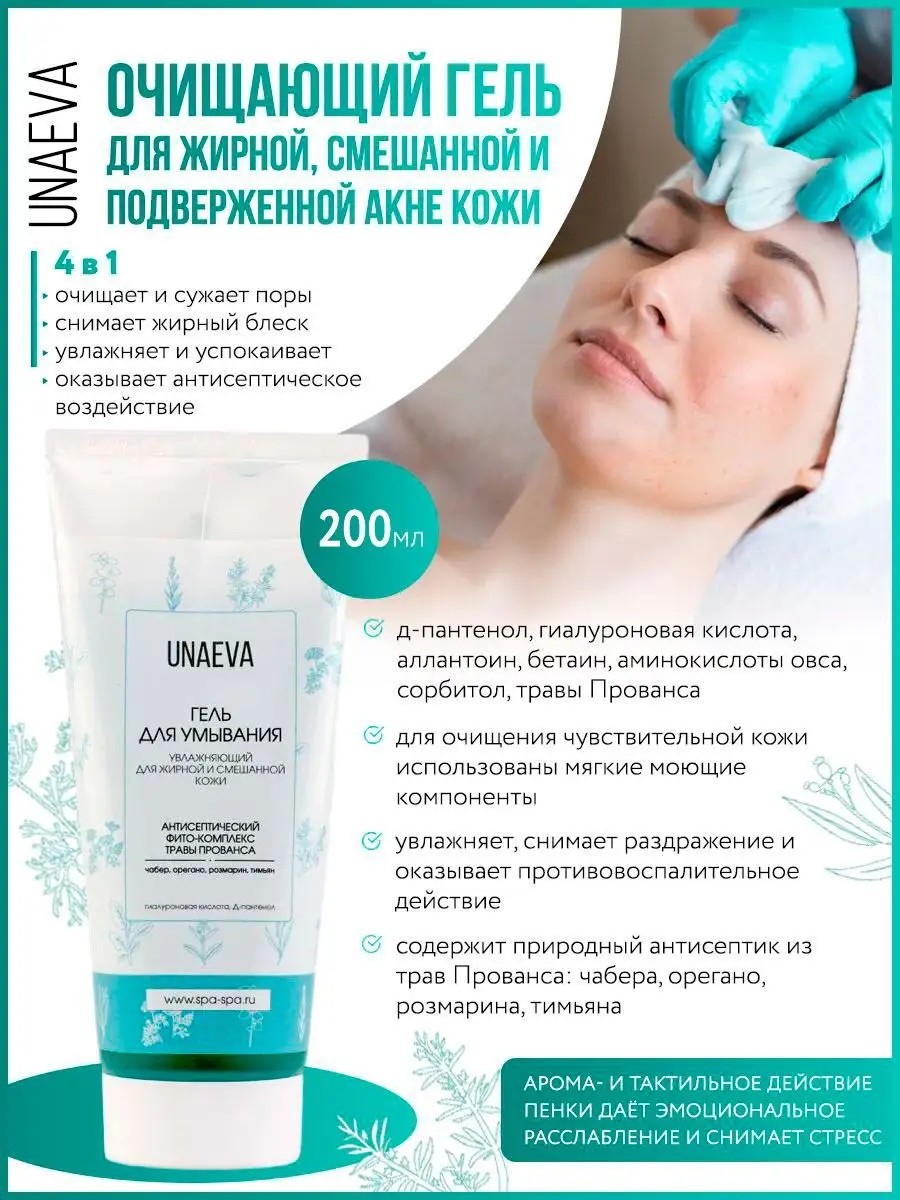 4 in 1: Cleanses and tightens pores, removes oily shine, moisturizes and soothes, has an antiseptic effect. - Mild cleansing components were used for cleansing sensitive skin. - The gel helps to tighten pores and normalize sebum production. - Moisturizes, relieves irritation and has an anti-inflammatory effect. - Contains a natural antiseptic from Provencal herbs: savory, oregano, rosemary, thyme. - Especially for sensitive skin, mild cleansing components without SLS were used. - Betaine - a component from beetroot juice - compensates for the effects of detergents on the skin, maintains its barrier functions. - Allantoin is designed to cleanse pores, normalize sebum production, prevent the formation of comedones, relieve inflammation. - Moisturizing effect of a quartet of d-panthenol, hyaluronic acid, sorbitol and aloe extract. - An extract of Provencal herbs (savory, oregano, rosemary, and thyme) provides an antiseptic effect. - D-panthenol has powerful moisturizing, anti-inflammatory, and regenerating properties. - Allantoin intensely moisturizes the skin, helps tighten pores, and normalizes sebum production, while also having anti-inflammatory properties. - A salt of hyaluronic acid with a smaller molecular size. It penetrates deeper layers of the skin and provides a moisturizing effect. - Sorbitol hydrates the skin and absorbs moisture from the environment. - Savory extract, thanks to its antiseptic action, helps cleanse the skin, neutralize infection, and soothe irritations. - Oregano extract exhibits antimicrobial, keratolytic, and antioxidant properties. - Rosemary extract exhibits antioxidant, antiseptic, and anti-inflammatory activity. - Thyme extract exhibits antibacterial, antifungal, and antiviral activity. - Glycerin helps moisturize the skin and strengthen the lipid barrier. - Betaine, a component from beet juice, moisturizes, relieves skin irritation, and compensates for the effect of surfactants on the skin. - Sodium lauroyl oat amino acids, a mild cleansing component from oat amino acids. Does not irritate the skin and does not disrupt its barrier functions. - Cocamidopropyl betaine is produced from coconut oil. A mild amphoteric surfactant. Does not irritate the skin, conditions, and has an antistatic effect. - Sodium laureth sulfate is a detergent, a gentle alternative to SLS for the skin. - Directions for use: apply a small amount of gel to damp skin and massage gently. Rinse thoroughly with warm water. Recommended for daily use. - UNAEVA moisturizing cleansing gel with herbs of Provence is manufactured in accordance with GOST 31696-2012. The gel was tested by the Microbiological Testing Laboratory and the Toxicology Testing Laboratory. The cream complies with the requirements of TR CU 009/2011 "On the safety of perfumery and cosmetic products." - Cleansing gel for washing oily, combination and acne-prone skin, from blackheads, blackheads, pimples and blemishes. Gifts for women beauty gel for pore cleansing. For a friend, mother, loved one, husband, beloved, daughter, son, teenager with problem skin, from pimples and acne. Gel for fighting imperfections, skin care, facial care.