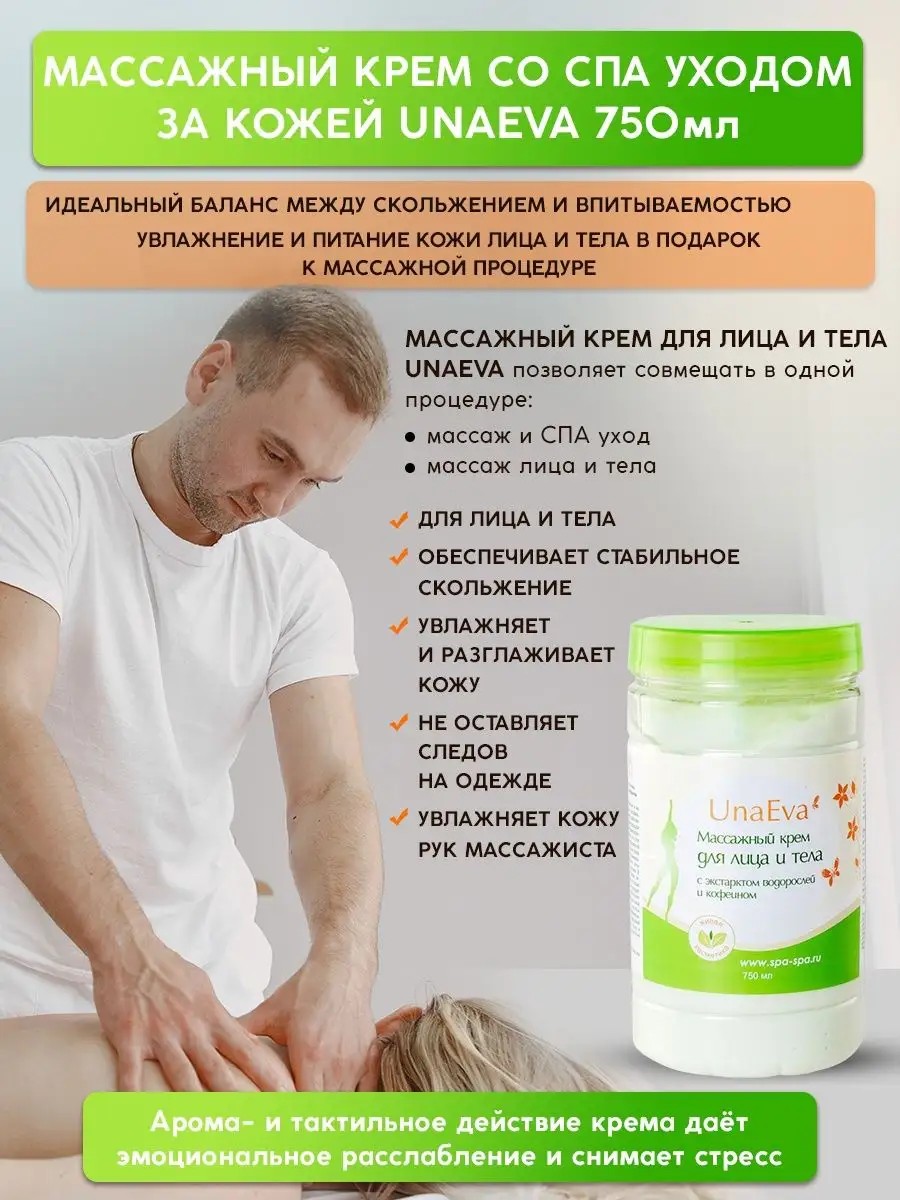 Массажный крем со СПА уходом за кожей. В креме реализован идеальный баланс между скольжением и впитываемостью. Крем обеспечит стабильное скольжение при массаже и не оставит жирных следов на одежде по окончании процедуры. - Крем для работы по лицу и телу, позволяет проводить массаж лица и тела в одной процедуре. Крем дает бонус к процедуре массажа: благодаря активным компонентам кожа увлажняется и разглаживается. - Крем можно использавать при классическом, спортивном, лимфодренажном, медицинском, антицеллюлитном, моделирующем массажах и различных видах массажа лица. - Активные компоненты крема: - Экстракты фукуса и ламинарии омолаживает кожу активизируя обменные процессы, улучшая микроциркуляцию, питая кожу микроэлементами, способствуя выведению токсинов и расщеплению жиров - Кофеин стимулирует клетожные жизненные процессы, стимулирует микроциркуляцию и распад жиров, улучшает тонус сосудов - Хлорофиллокаротиновая паста повышает местный кожный иммунитет и оказывает бактерицидное действие - Масло какао содержит липидный комплекс восстанавливающий защитную мантию кожи, уменьшает сухость и шелушение, способствует восстановлению механизма самоочищения кожи - Масло зародышевой пшеницы увлажняет, снимает раздражение, стимулирует регенерацию клеток кожи - Витамин Е является мощнейшим антиоксидантом - Глицерин способствуют увлажнению кожи и укреплению липидного барьера - Крем можно использовать для ухода за сухой и чувствительной кожей Массажный крем для лица и тела с экстрактом водорослей и кофеином UNAEVA изготовлен в соответствии с ГОСТ 31460-2012. Испытание крема проводили Испытательная микробиологическая лаборатория и Испытательная токсикологическая лаборатория. Крем соответствует требованием ТР ТС 009/2011 «О безопасности парфюмерно-косметической продукции» Подарки женщинам красота крем кремы. Подруге, маме, любимой. Крем борьба с несовершенствами, антицеллюлитный уход за кожей для душа и ванной, уход за ногами, восстанавливает упругость и эластичность, для лица и зоны декольте.