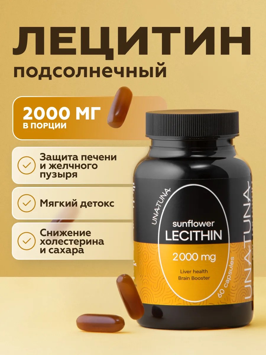 The body's lecithin reserves must be replenished daily, making UNA TUNA dietary supplements ideal for comprehensive support of both men and women. Regular intake of lecithin helps restore the nervous system, improve brain function, detoxify the body, strengthen the heart and blood vessels, and normalize liver and kidney function.