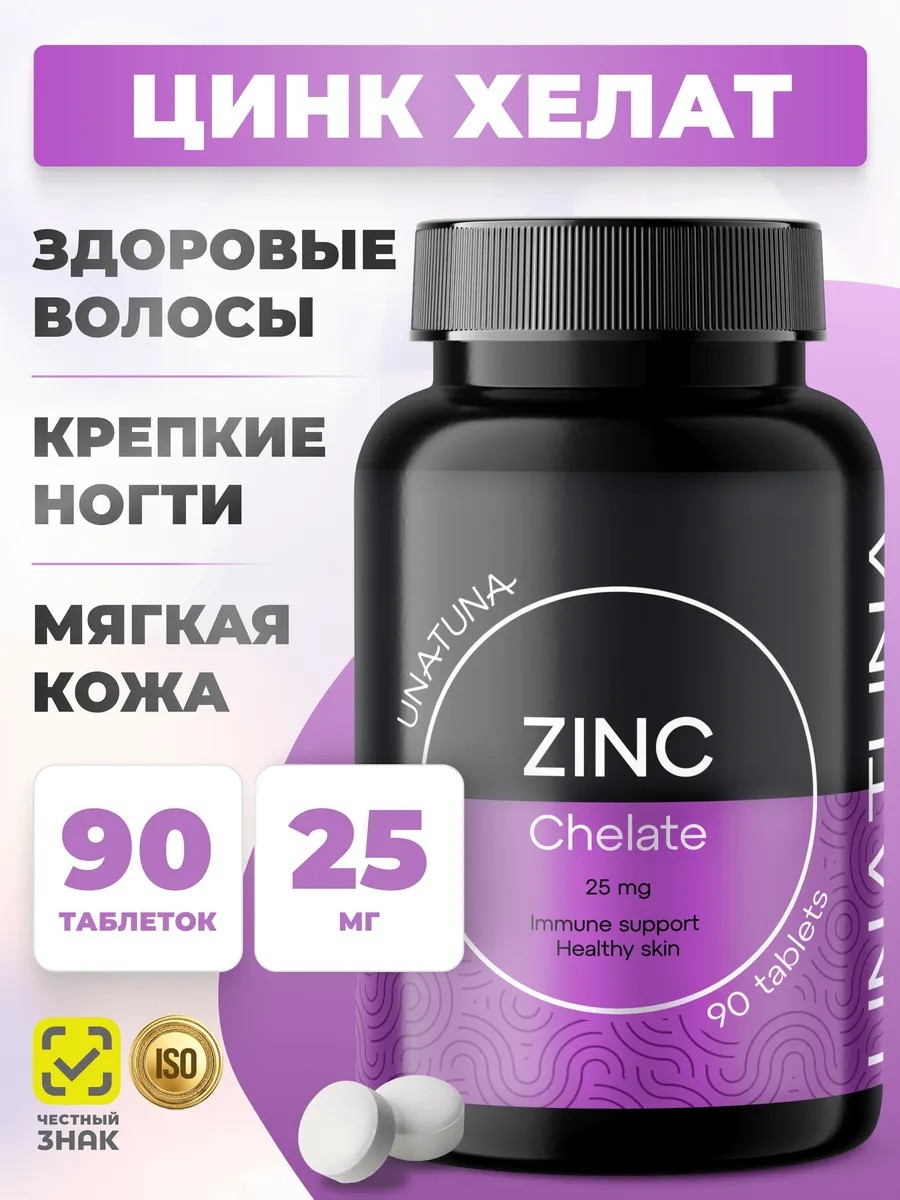 Цинк витамины от Una Tuna - витаминный комплекс для здоровой кожи и крепкого иммунитета. Эффективная и безопасная формула для достижения быстрого результата. Хелат цинка - максимально биодоступная форма цинка. Содержит 25 мг цинка в суточной дозировке. Zinc Chelate стимулирует рост волос и укрепляет ногти, улучшает состояние кожи, ускоряет заживление, укрепляет иммунитет, улучшает память и концентрацию. UnaTuna витамины цинк снижают уровень кортизола, нормализуют баланс половых гормонов и повышают либидо. Цинк БАД от Уна Туна соответствует европейским стандартам качества. В составе добавок нет ГМО, сои, глютена и лактозы. Высочайшую степень очистки сырья и контроль качества на всех этапах производства подтверждает сертификат безопасности международной классификации ISO 22000. Общие рекомендации по приему: взрослым принимать по 1 таблетке 1 раз в день во время еды. Продолжительность приема –1 месяц. При необходимости прием можно повторить. Дополнительное : Витамин Цинк Хелат – это биологически активная добавка к пище, которое сочетает в себе свойства минерала цинка и аминокислоты. Данный продукт является мультивитамином для женщин и мужчин. Цинк витамин способствует поддержанию здоровья кожи, волос и ногтей, а также укрепляет иммунитет. Он является эффективным средством против выпадения волос и от прыщей, а также помогает бороться со стрессом и усталостью.