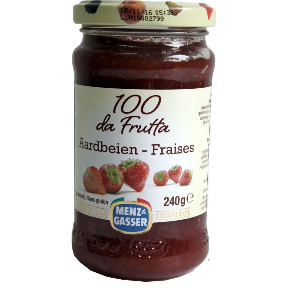 Menz Gasser Fruitbeleg met Aardbeien Verre 240 g (spread with strawberries).