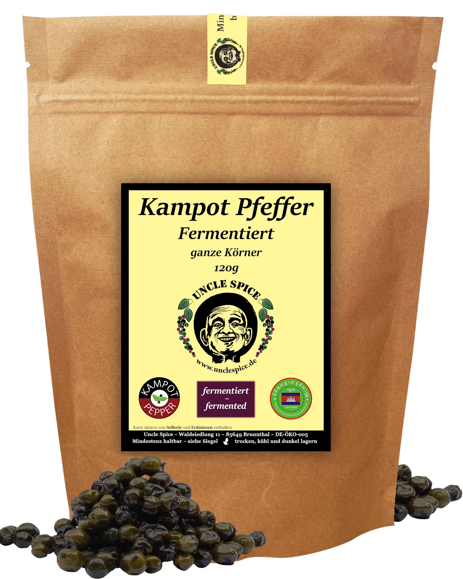 Aroma guarantee - 120g fermented campot packed pepper and additionally vacuumed in the practical resealable standing floor bag.Easy in design, impermeable and easy to close again.Like all spices, Kampot pepper likes it dry, dark and cool.Our green campot pepper is best store in the fridge.So the fresh aroma remains the longest.Perfectly suitable as a gift for family, friends, acquaintances and hobby chefs.Intensive aroma - fermented campot pepper.A symphony of pepper aromas.Unrolved green pepper berries with a pinch of sea salt, enter into a fermentation process, which makes the fresh aromas of the green campot pepper durable.The fresh pepper berries initially taste slightly sour, salty.After a short time, indescribable highly intensive, sharp pepper juices emerge.Fits very well with steaks, salads and grilled vegetables.A rarity in the highest quality - we at Uncle Spice only sell the most current harvest of the highest quality.This means that you not only get the most aromatic Kampot pepper of the year from us, but also the Kampot Pfeffer, which is completely freed from bad grains.In several steps, all foreign bodies, qualitatively weak and gray berries are sorted out.In addition, our pepper is cleaned in germ -free water.Premium quality produced - we at Uncle Spice cooperate with a small farm from the south of the province of Kampot.There every pepper shrub is constantly under strict assessment.The pepper berries are already checked for the highest quality on the shrub.Only biological fertilizers such as Guano (bat droppings) are used.Each single pepper grain must be picked by the panicle, since the grains are ripe at different times!.Fermented Kampot Pfeffer - from Cambodia directly from the pepper farm - with love and gently produced.Excellent quality, made according to the old ecological tradition.In the certified growing regions of the Kampot and KEP, the old traditions are preserved, particularly by small pepper farms.Fermented campot pepper is fresh, green, non -dried pepper, which is mixed with a small proportion of sea salt flakes.AROMA-GARANTIE - 120g fermentierter Kampot Pfeffer verpackt und zusätzlich vakuumiert im praktischen wiederverschließbaren Standbodenbeutel. Ansehnlich im Design, lichtundurchlässig und einfach wieder zu verschließen. Wie alle Gewürze mag es Kampot Pfeffer trocken, dunkel und kühl. Am besten lagert sich unser grüner Kampot Pfeffer im Kühlschrank. So bleibt das frische Aroma am längsten erhalten. Perfekt geeignet als Geschenk für Familie, Freunde, Bekannte und Hobbyköche. INTENSIVES AROMA – FERMENTIERTER KAMPOT PFEFFER. Eine Symphonie von Pfefferaromen. Nicht getrocknete grüne Pfefferbeeren mit einer Prise Meersalz versetzt, treten in einen Fermentationsprozess, womit die frischen Aromen des grünen Kampot Pfeffers haltbar gemacht werden. Die frischen Pfefferbeeren schmecken anfangs leicht säuerlich, salzig. Nach kurzer Zeit treten unbeschreibliche hochintensive, scharfe Pfeffersäfte hervor. Passt ausgesprochen gut zu Steaks, Salaten und gegrilltem Gemüse. EINE RARITÄT IN HÖCHSTER GÜTE – Wir von Uncle Spice vertreiben ausschließlich die aktuellste Ernte in höchster Qualität. Das bedeutet, Sie bekommen von uns nicht nur den aromatischsten Kampot Pfeffer des Jahres, sondern auch den Kampot Pfeffer, der komplett von schlechten Körnern befreit ist. In mehreren Schritten werden alle Fremdkörper, qualitativ schwache sowie graue Beeren aussortiert. Zusätzlich wird unser Pfeffer in keimfreien Wasser gereinigt. IN PREMIUM-QUALITÄT PRODUZIERT - Wir von Uncle Spice kooperieren mit einer kleinem Farm aus dem Süden der Provinz Kampot. Dort ist jeder Pfefferstrauch ständig unter strenger Begutachtung. Die Pfefferbeeren werden schon am Strauch auf höchste Qualität geprüft. Ausschließlich biologische Düngemittel wie z.B. Guano (Fledermauskot) werden eingesetzt. Jedes einzelne Pfefferkorn muss in Handarbeit von der Rispe gepflückt werden, da die Körner zu unterschiedlichen Zeitpunkten reif sind!. FERMENTIERTER KAMPOT PFEFFER – aus Kambodscha direkt von der Pfefferfarm - mit Liebe handverlesen und schonend produziert. Ausgezeichnete Qualität, nach alter ökologischer Tradition hergestellt. In den zertifizierten Anbauregionen Kampot und Kep werden besonders durch kleine Pfefferfarmen die alten Traditionen bewahrt. Fermentierter Kampot Pfeffer ist frischer, grüner, nicht getrockneter Pfeffer, welcher mit einem geringen Anteil an Meersalzflocken versetzt wird.UNCLE SPICE® fermentierter Kampot Pfeffer - 120g echter Kampot Pfeffer fermentiert - Premiumqualität - ganze frische grüne Pfefferbeeren, echter grüner Pfeffer aus Kambodscha