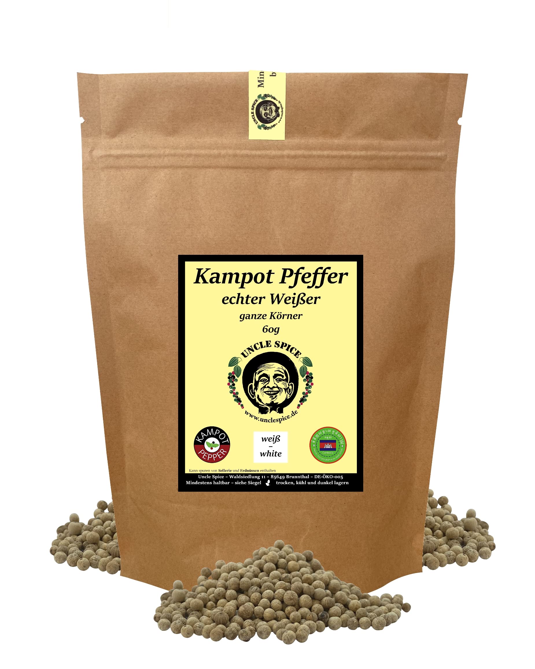 Aroma guarantee - 60g white campot pepper packed in a practical recoverable cork glass.Like all spices, Kampot pepper likes it dry, dark and cool.In terms of design and easy to close again - ideal for the storage of our Kampot pepper in premium quality.Also ideal as a gift for friends, acquaintances and hobby chefs.Intensive aroma - white campot pepper.Only by washing the red fruit bowl into germ -free water and a quick and precise drying process in the sun does the white campot pepper arise.The white cores of the pepper fruit are characterized by a soft citrus -like fragrance.An aroma, completely free of musty notes that often occur with white pepper.A sharp pepper accompanied by a slightly nutty note.Suitable for light meat, fish and sauces.A rarity in the highest quality - we at Uncle Spice only sell the most current harvest of the highest quality.This means that you not only get the most aromatic Kampot pepper of the year from us, but also the Kampot Pfeffer, which is completely freed from bad grains.In several steps, all foreign bodies, qualitatively weak and gray berries are sorted out.In addition, our pepper is cleaned in germ -free water and then gently sun -dried.Premium quality produced - we at Uncle Spice cooperate with a small farm from the south of the province of Kampot.There every pepper shrub is constantly under strict assessment.The pepper berries are already checked for the highest quality on the shrub.Only biological fertilizers such as Guano (bat droppings) are used.Each single pepper grain must be picked by the panicle, since the grains are ripe at different times!.Real white Kampot Pfeffer - from Cambodia directly from the pepper farm - with love and gently dried in the sun.Excellent quality, made according to the old ecological tradition.In the certified growing regions of the Kampot and KEP, the old traditions are preserved, particularly by small pepper farms.For the white campot pepper, the fresh red peppercorns are harvested and then put in water for a while until the outer shell detaches.AROMA-GARANTIE - 60g weißer Kampot Pfeffer verpackt im praktischen wiederverschließbaren Korkenglas. Wie alle Gewürze mag es Kampot Pfeffer trocken, dunkel und kühl. Ansehnlich im Design und einfach wieder zu verschließen – Ideal zur Aufbewahrung unseres Kampot Pfeffers in Premiumqualität. Auch bestens geeignet als Geschenk für Freunde, Bekannte und Hobbyköche. INTENSIVES AROMA - WEIßER KAMPOT PFEFFER. Erst durch das Abwaschen der roten Fruchtschale in keimfreien Wasser sowie einem schnellen und präzisen Trocknungsprozess in der Sonne, entsteht der weiße Kampot Pfeffer. Die weißen Kerne der Pfefferfrucht sind von einem weichen zitrusartigen Duft geprägt. Ein Aroma, völlig frei von muffigen Noten, wie sie häufig bei weißem Pfeffer vorkommen. Ein scharfer Pfeffer begleitet von einer leicht nussigen Note. Passend zu hellem Fleisch, Fisch und Soßen. EINE RARITÄT IN HÖCHSTER GÜTE - Wir von Uncle Spice vertreiben ausschließlich die aktuellste Ernte in höchster Qualität. Das bedeutet, Sie bekommen von uns nicht nur den aromatischsten Kampot Pfeffer des Jahres, sondern auch den Kampot Pfeffer, der komplett von schlechten Körnern befreit ist. In mehreren Schritten werden alle Fremdkörper, qualitativ schwache sowie graue Beeren aussortiert. Zusätzlich wird unser Pfeffer in keimfreien Wasser gereinigt und anschließend schonend sonnengetrocknet. IN PREMIUM-QUALITÄT PRODUZIERT - Wir von Uncle Spice kooperieren mit einer kleinem Farm aus dem Süden der Provinz Kampot. Dort ist jeder Pfefferstrauch ständig unter strenger Begutachtung. Die Pfefferbeeren werden schon am Strauch auf höchste Qualität geprüft. Ausschließlich biologische Düngemittel wie z.B. Guano (Fledermauskot) werden eingesetzt. Jedes einzelne Pfefferkorn muss in Handarbeit von der Rispe gepflückt werden, da die Körner zu unterschiedlichen Zeitpunkten reif sind!. ECHTER WEIßER KAMPOT PFEFFER - aus Kambodscha direkt von der Pfefferfarm - mit Liebe handverlesen und schonend in der Sonne getrocknet. Ausgezeichnete Qualität, nach alter ökologischer Tradition hergestellt. In den zertifizierten Anbauregionen Kampot und Kep werden besonders durch kleine Pfefferfarmen die alten Traditionen bewahrt. Für den weißen Kampot Pfeffer werden die frischen roten Pfefferkörner geerntet und anschließend einige Zeit in Wasser gelegt, bis sich die äußere Schale ablöst.Uncle Spice weißer Kampot Pfeffer - 60g Kampot Pfeffer weiß - Premiumqualität - ganze sonnengetrocknete Pfefferbeeren, weiße Pfefferkörner ganz, handverlesen für die Mühle, Ideal für Soßen