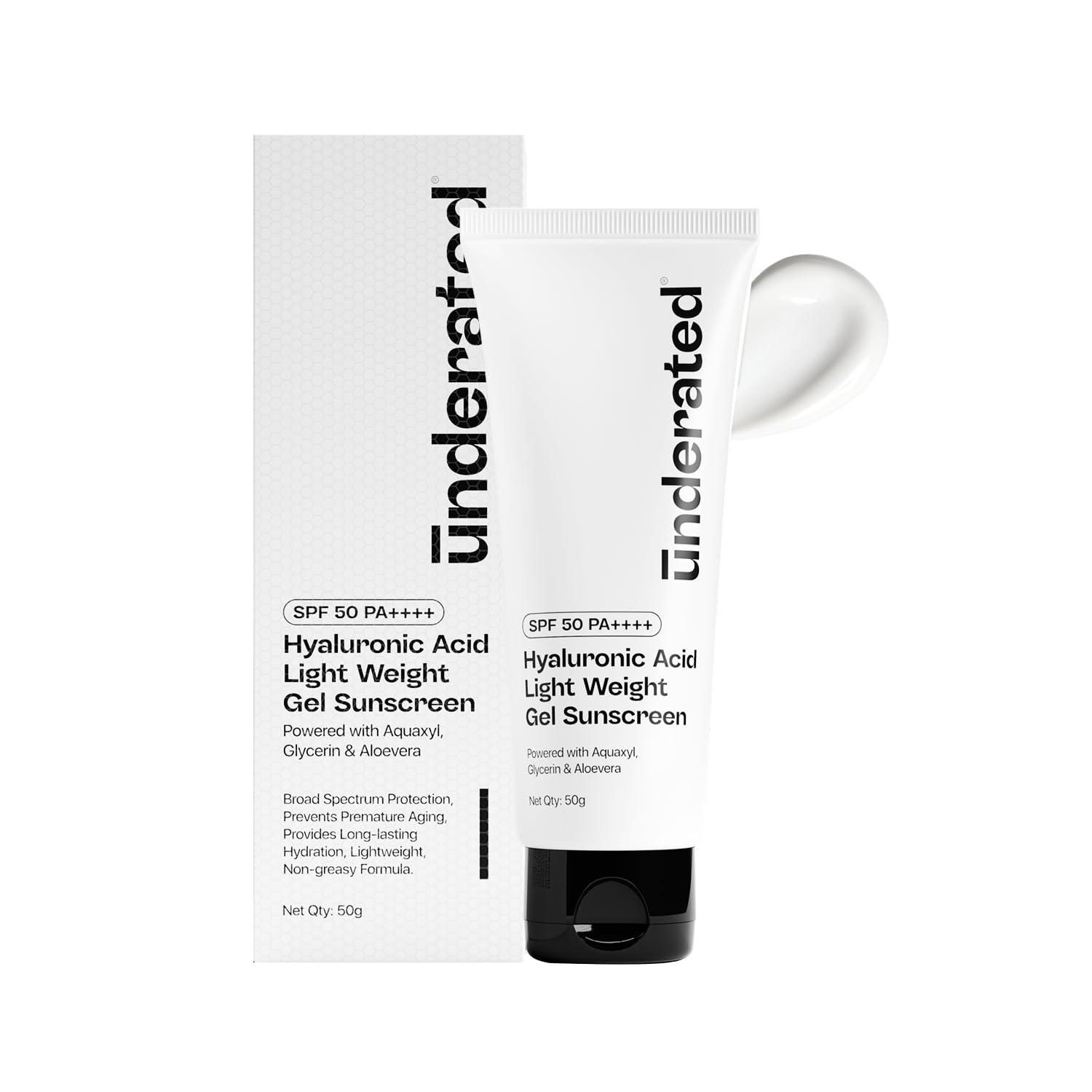 Underated Lightweight Gel Sunscreen SPF 50 PA++++ | Hydrating Formula with Hyaluronic Acid Aquaxyl & Aloe Vera | Non-Greasy Broad Spectrum | For All Skin Types | 50g
