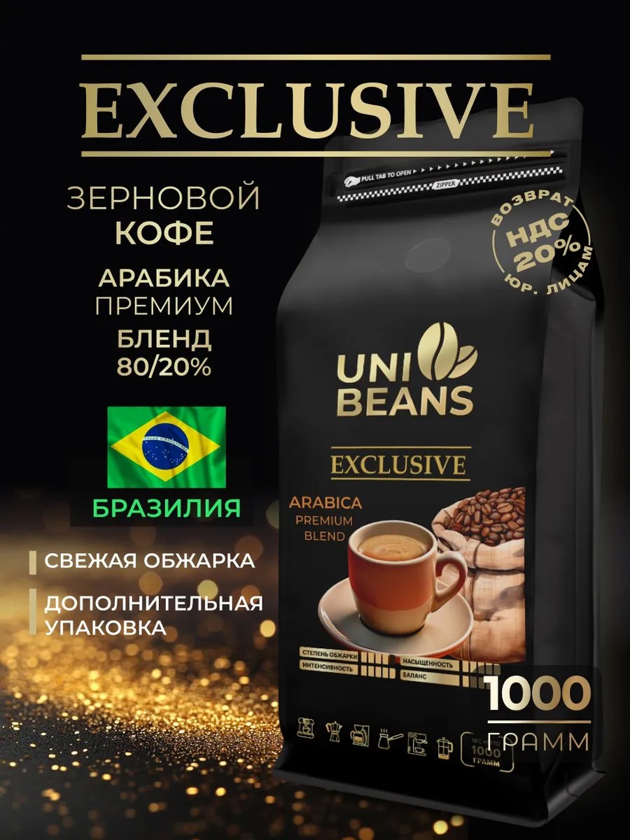 Бразильский зерновой кофе 1 кг КОФЕ UNIBEANS EXCLUSIVE (Юнибинс Эксклюзив) — популярный бленд бразильских сортов кофейных зерен средней обжарки, в котором лидирует ароматная арабика, а робуста добавляет энергии и сил (80% арабика и 20% робуста)