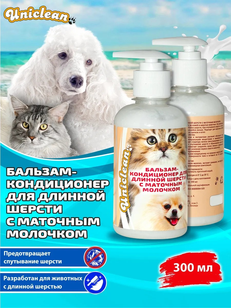 | Комплектация | коробка - 1 шт; Бальзам-кондиционер для длинной шерсти с маточным молочком Uniclean 300мл-1шт |