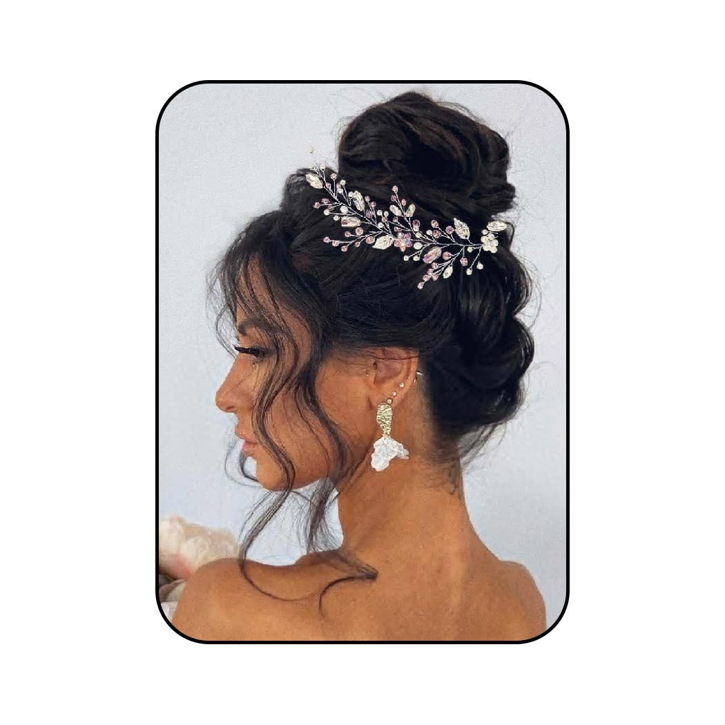 Unicra Bride Wedding Hair Vine Pink Rhinestone Flower Hair Accessories Silver Crystal Bridal Headband Headpiece for Women and Girls