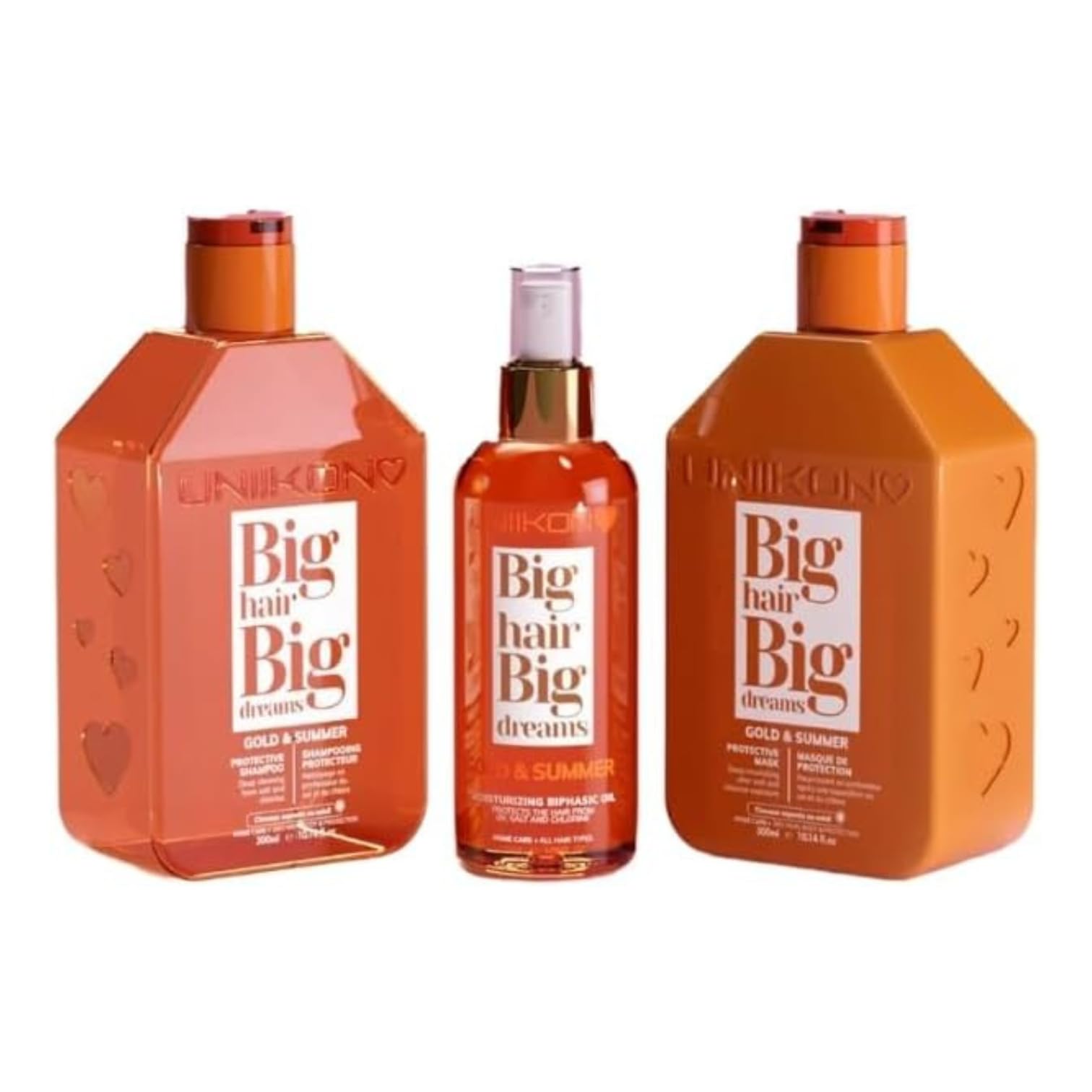 Directions: After sun exposure, apply a generous amount of shampoo to wet hair, massage gently, then rinse thoroughly. Apply the mask to towel-dried hair, leave on for 5 minutes, then rinse. Also use the mask on your skin in the shower for complete care. It can also be applied without rinsing before swimming to protect your hair. The bi-phase sun oil is applied to skin and hair during sun exposure. Shake the bottle well before each use and repeat the application as needed. It gives your skin a satiny softness and iridescent shine, for a radiant summer from the first application. This set reduces frizz, promotes growth, and limits breakage thanks to a complex of omega 3 and 6 fatty acids, for stronger, brighter, and more luminous hair. It provides intense hydration to your hair, nourishing it from roots to ends, while soothing your skin damaged by the sun. Discover the complete Uniikon Gold Summer set, including a 300ml shampoo, a 300ml mask, and a 120ml two-phase sun oil with a shine effect. This kit, enriched with coconut extract and provitamin B5, protects and nourishes your hair and skin against summer aggressions (UV, chlorine, salt).Utilisation : Après l'exposition au soleil, appliquez une noisette généreuse de shampooing sur cheveux mouillés, massez doucement, puis rincez abondamment. Appliquez le masque sur cheveux essorés, laissez poser pendant 5 minutes, puis rincez. Utilisez également le masque sur la peau sous la douche pour un soin complet. Il peut aussi être appliqué sans rinçage avant la piscine pour protéger vos cheveux. L'huile solaire biphasée s'applique sur la peau et les cheveux lors de l'exposition au soleil. Agitez bien le flacon avant chaque utilisation et répétez l'application selon vos besoins. Il apporte à votre peau une douceur satinée et une brillance irisée, pour un été éclatant dès la première application. Ce coffret réduit les frisottis, favorise la pousse et limite la casse grâce à un complexe d'acides gras oméga 3 et 6, pour des cheveux plus forts, éclatants et lumineux. Il offre une hydratation intense à vos cheveux, les nourrissant des racines aux pointes, tout en apaisant votre peau malmenée par le soleil. Découvrez le coffret complet Uniikon de la gamme Gold Summer, comprenant un shampooing de 300 ml, un masque de 300 ml et une huile solaire biphasée à effet brillant de 120 ml. Ce kit, enrichi en extrait de noix de coco et provitamine B5, protège et nourrit vos cheveux et votre peau contre les agressions estivales (UV, chlore, sel).