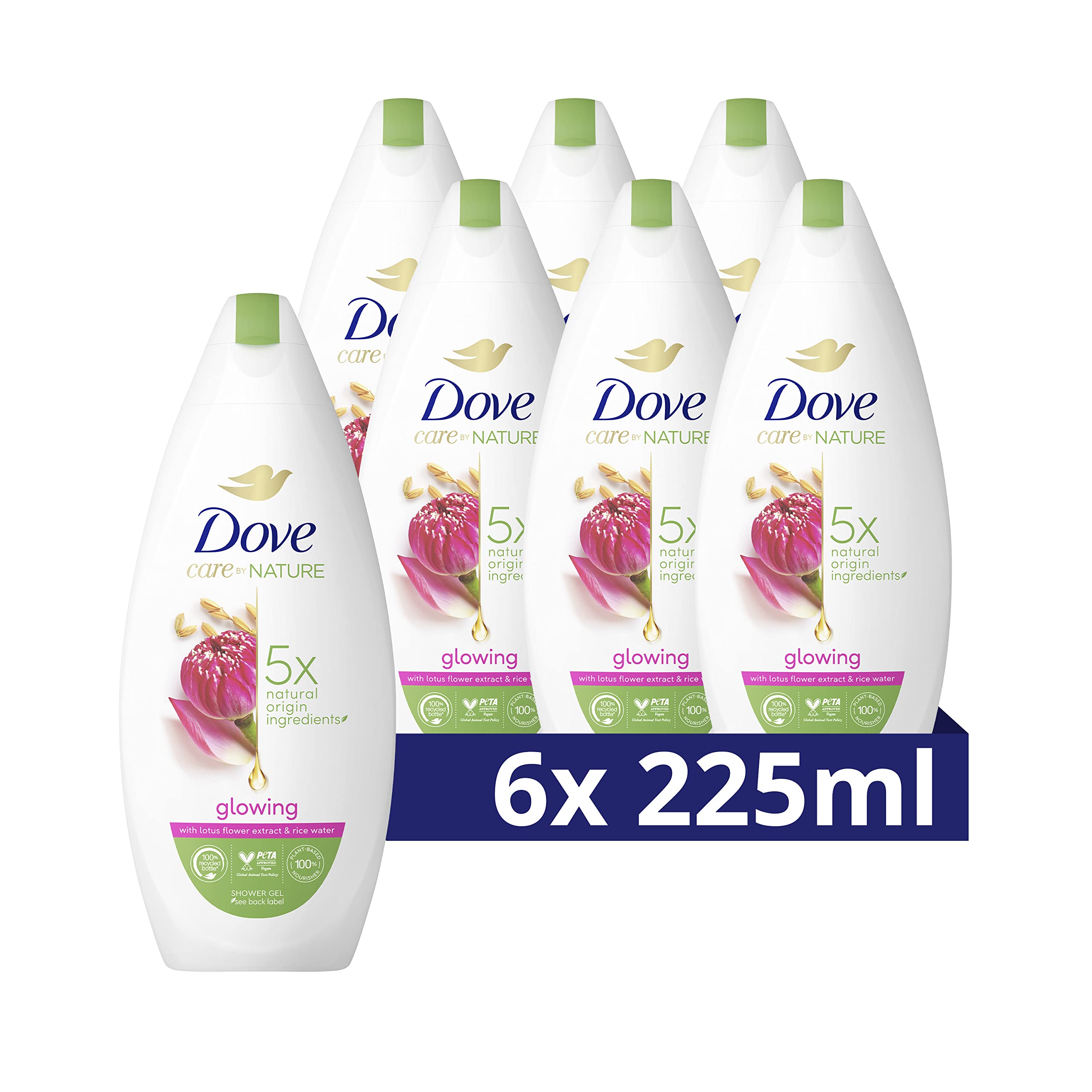About Dove Care by Nature Glowing Shower Gel: Instantly experience hydrated and radiant skin with Dove Care by Nature Glowing Shower Gel. This nourishing shower gel is suitable for all skin types and hydrates the skin in a beneficial way. This immediately makes dry and dull skin softer and smoother in just one shower. You will love the scent of lotus flower extract and rice water, ingredients known for their purifying and brightening properties. You enjoy the power of nature, but in your own shower. This way you can step out of your shower fresh and radiant, every day. The Dove Care by Nature Glowing Shower Gel consists of 92 natural ingredients. The shower gel contains 5 different ingredients of natural origin such as prebiotic nutrients, vegetable extract, mild vegetable cleansers and vegetable skin nourishing and moisturizing ingredients. This strengthens your skin during every shower, without affecting the natural skin microbiome. The nourishing formula of Dove Care by Nature Glowing provides immediate and long-lasting nourishment to the skin, in a natural way. This body wash contains no sulfate cleansers, is 92 biodegradable and is packaged in 100 recycled plastic bottles . Dove Glowing Shower Gel is certified as 'Vegan' by PETA. How to use: Squeeze a dash of shower cream into your palm. Massage the luxurious foaming formula onto your skin and enjoy the rich foam and fresh scent. Rinse off with warm water to reveal soft, refreshed and radiant skin. Dove takes care of everyone: When it comes to skin care, we at Dove want to give you products you can trust. But Dove's care goes beyond just our products. We want to care for all women, we want to redefine beauty standards and help everyone experience beauty and body image in a positive way. Our mission is to ensure that the next generation grows up with a positive image of themselves and their appearance. Through the Dove Self-Esteem Project we want to ensure that there is no room for unrealistic beauty ideals in the world women encounter. How we make our products and what goes into them, the impact we have on our planet and the pursuit of a better, more sustainable way of life is important to us. 92 of ingredients break down into carbon dioxide, water and minerals (OECD Test Methods 301,302, 310). Except the cap. MANUFACTURER CONTACT INFORMATION 455 3013 AL NL92 biodegradable shower gel in a 100 recyclable bottle. This Dove shower gel consists of 92 natural ingredients. This nourishing shower gel is also suitable for dry skin. Mild cleansing and hydration for your skin. For clean, soft and radiant skin. Dove Care by Nature Glowing Shower Gel with lotus flower extract and rice water.Dove Care by Nature Glowing Verzorgende Douchegel, met lotusbloemextract en rijstwater - 6 x 225 ml - Voordeelverpakking Over Dove Care by Nature Glowing Douchegel: Ervaar direct een gehydrateerde en stralende huid met Dove Care by Nature Glowing Douchegel. Deze verzorgende douchegel is geschikt voor alle huidtypen en hydrateert de huid op weldadige wijze. Hierdoor wordt de droge en doffe huid direct zachter en gladder in slechts één douchebeurt. Je zult genieten van de geur van lotusbloemextract en rijstwater, ingrediënten die bekendstaan om hun zuiverende en verhelderende eigenschappen. Je geniet van de kracht van de natuur, maar dan onder je eigen douche. Zo stap jij fris en stralend je douche uit, elke dag opnieuw. De Dove Care by Nature Glowing Douchegel bestaat voor 92 uit natuurlijke ingrediënten. De douchegel bevat 5 verschillende ingrediënten van natuurlijke oorsprong zoals prebiotische voedingsstoffen, plantaardig extract, milde plantaardige reinigers en plantaardige huidvoedende- en vochtinbrengende bestanddelen. Hierdoor wordt je huid versterkt tijdens elke douchebeurt, zonder dat de natuurlijke huidmicrobioom wordt aangetast. De verzorgende formule van Dove Care by Nature Glowing geeft onmiddellijke en langdurige voeding aan de huid, op een natuurlijke manier. Deze bodywash bevat geen sulfaatreinigers, is voor 92 biologisch afbreekbaar en wordt verpakt in 100 gerecyclede plastic flessen . Dove Glowing Douchegel is door PETA gecertificeerd als 'Vegan'. Hoe te gebruiken: Knijp een scheutje douchecrème in je handpalm. Masseer de luxe schuimende formule op je huid en geniet van het rijke schuim en de frisse geur. Spoel af met warm water om een zachte, verfriste en stralende huid te onthullen. Dove zorgt voor iedereen: Wanneer het om huidverzorging gaat, willen wij van Dove je producten geven waar je op kunt vertrouwen. Maar de zorg van Dove gaat verder dan onze alleen onze producten. We willen zorg dragen voor alle vrouwen, we willen schoonheidsnormen opnieuw definiëren en iedereen helpen om schoonheid en je lichaamsbeeld op een positieve manier te ervaren. Onze missie is om ervoor te zorgen dat de volgende generatie opgroeit met een positief beeld over zichzelf en hun uiterlijk. Via het Dove Self-Esteem Project willen we ervoor zorgen dat er in de wereld waarin vrouwen terechtkomen geen plaats is voor onrealistische schoonheidsidealen. Hoe we onze producten maken en wat erin gebruikt wordt, de impact die we hebben op onze planeet en het streven naar een betere, duurzamere manier van leven is belangrijk voor ons. 92 van de ingrediënten breekt af in kooldioxide, water en mineralen (OESO-testmethoden 301,302, 310). M.u.v. de dop. CONTACTINFORMATIE FABRIKANT 455 3013 AL NL92 biologisch afbreekbare douchegel in een 100 recyclebare fles. Deze Dove douchegel bestaat voor 92 uit natuurlijke ingrediënten. Deze verzorgende douchegel is ook geschikt voor de droge huid. Milde reiniging en hydratatie voor je huid. Voor een schone, zachte en stralende huid. Dove Care by Nature Glowing Douchegel met lotusbloemextract en rijstwater.