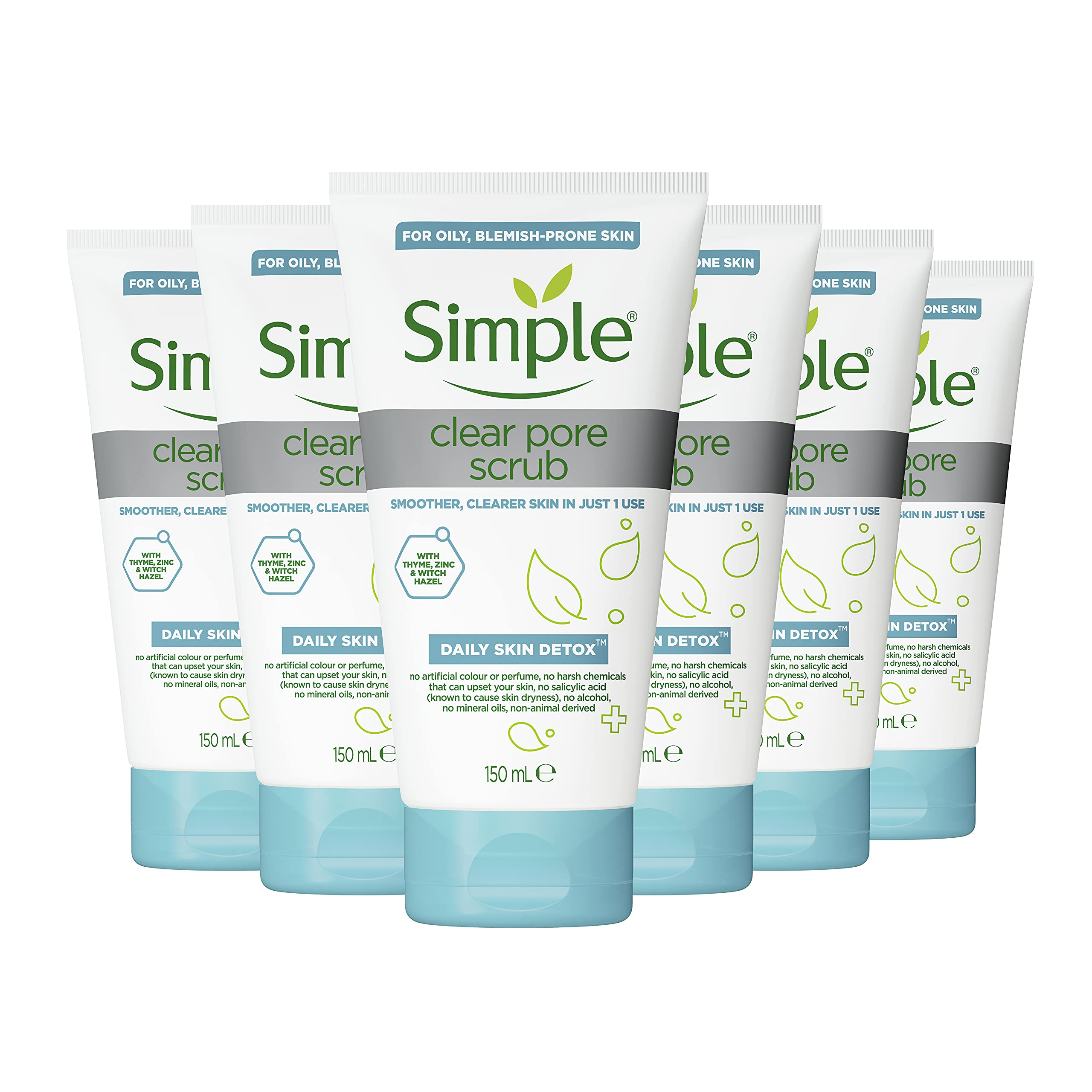 Refresh and renew your skin with the new Simple Daily Skin Detox Clear Pore Scrub, our exfoliating scrub specially formulated for oily skin. Blended with thyme, zinc, and witch hazel, this facial scrub deeply cleanses to help remove pore-clogging dirt, oil, and makeup, leaving skin purified. Added bamboo exfoliants gently refine pores and rough, uneven patches, leaving skin clear and smooth. When skin is exposed to external aggressors such as heat, pollution, or products containing harsh chemicals, it can become sensitized and trigger an overproduction of oil and sebum. eventually clogging pores and causing blemishes. Removing excess oil is essential to prevent new imperfections from forming. But using a facial cleanser or scrub can weaken the skin's defenses against harmful bacteria, leaving it prone to blemishes and imperfections. If you're looking for a gentle way to get rid of oily skin, the Daily Skin Detox Clear Pore Scrub is the perfect combination of effectiveness and kindness thanks to its unique detoxifying formula. It's fortified with 5 active witch hazel, a natural astringent known for its effectiveness against oil while being soothing and gentle on the skin. The scrub's ultra-fine bamboo particles gently exfoliate dead skin cells and refine pores, while also helping to absorb excess oil for an instant mattifying effect. Our Daily Skin Detox range is made without harsh chemicals, artificial fragrances or colors, salicylic acid, or alcohol. Simple's natural facial scrub is free of parabens, phthalates, and mineral oils. Made without animal-derived ingredients, our facial scrub is PETA-certified cruelty-free and vegan. Directions: Lather a small amount in your hands. Using light pressure, massage onto damp skin and rinse thoroughly. Designed to address oily skin in the gentlest way, we recommend using 2 to 3 times per week. INGREDIENTS Aqua, Hamamelis Virginiana Leaf Water, Cocamidopropyl Betaine, Glycerin, Bambusa Arundinacea Stem Extract, Sodium Laureth Sulfate, Acrylates C10-30 Alkyl Acrylate Crosspolymer, PEG-7 Glyceryl Cocoate, Phenoxyethanol, Sodium Chloride, Zinc PCA, Sodium Hydroxide, Panthenol, Xanthan Gum, Benzophenone-4-Sodium Benzoate, Hydroxypropyl Cyclodextrin, Citric Acid, Niacinamide, Thymus Vulgaris Flower Extract. DIRECTIONS Lather a small amount in your hands. Using light pressure, massage onto wet skin and rinse thoroughly. See moreThis facial scrub is PETA-certified cruelty-free and vegan, and made without harsh chemicals, artificial fragrances, or dyes—just like the entire Simple Daily Skin Detox line. Designed to address oily skin in the gentlest way, we recommend using the scrub 2 to 3 times a week. This facial scrub features natural bamboo exfoliants to sweep away dead skin cells and help prevent clogged pores. Our facial scrub is made with a detoxifying blend of thyme, zinc, and witch hazel to effectively remove oil and help prevent future blemishes. Specially formulated for oily skin, this facial scrub deeply cleanses away dirt, oil, and makeup while remaining gentle on the skin. Simple Daily Skin Detox Clear Pore Scrub leaves skin smoother and clearer after just one use.Simple Daily Skin Detox Clear Pore Scrub 6 x 150 mlDESCRIPTION DU PRODUIT DESCRIPTION DU PRODUIT Rafraîchissez et renouvelez votre peau avec le nouveau gommage anti-pores transparent Simple Daily Skin Detox, notre gommage exfoliant spécialement conçu pour les peaux grasses. Mélangé avec du thym, du zinc et de l'hamaméli, ce gommage facial nettoie en profondeur pour aider à éliminer la saleté, l'huile et le maquillage obstruant les pores pour laisser la peau purifiée. Les exfoliants en bambou ajoutés affinent doucement les pores et les taches rugueuses et inégales pour laisser la peau claire et lisse. Lorsque la peau est exposée à des agresseurs externes tels que la chaleur, la pollution ou les produits contenant des produits chimiques agressifs, elle peut devenir sensibilisée et déclencher une surproduction d'huile et de sébum. et finalement obstruer les pores et les taches. L'élimination de l'excès d'huile est essentielle pour empêcher de nouvelles imperfections de se former. Mais l'utilisation d'un nettoyant pour le visage ou d'un gommage pour le visage peut affaiblir la défense de la peau contre les bactéries nocives, la laissant sujette aux taches et aux imperfections. Si vous cherchez un moyen de vous débarrasser de la peau grasse de manière douce, le gommage simple Daily Skin Detox Clear Pore Scrub est la combinaison parfaite d'efficacité et de gentillesse grâce à sa formule détoxifiante unique. Il est renforcé avec 5 d'hamamélis actif, un astringent naturel connu pour son efficacité contre l'huile tout en étant apaisant et doux pour la peau. Les particules de bambou ultra-fines contenues dans le gommage exfolient doucement les cellules mortes de la peau et affinent les pores, tout en aidant à absorber l'excès d'huile pour un effet matifiant instantané. Notre gamme Daily Skin Detox est fabriquée sans produits chimiques agressifs, sans parfum ni colorant artificiel, sans acide salicylique ni alcool. L'exfoliant naturel pour le visage de Simple n'a pas ajouté de parabens ou de phtalates et sans huiles minérales. Sans ingrédients d'origine animale, notre gommage pour le visage est certifié sans cruauté envers les animaux et végétalien par PETA. Mode d'emploi : faites mousser une petite quantité dans vos mains. En utilisant une légère pression, massez sur la peau humide et rincez abondamment. Conçu pour résoudre les peaux grasses de la manière la plus douce, nous vous recommandons d'utiliser 2 à 3 fois par semaine. INGRÉDIENTS Aqua, Hamamelis Virginiana Leaf Water, Cocamidopropyl Betaine, Glycerin, Bambusa Arundinacea Stem Extract, Sodium Laureth Sulfate, Acrylates C10-30 Alkyl Acrylate Crosspolymer, PEG-7 Glyceryl Cocoate, Phenoxyethanol, Sodium Chloride, Zinc PCA, Sodium Hydroxide, Panthénol, Xanthan um, benzophénone- 4. Benzo