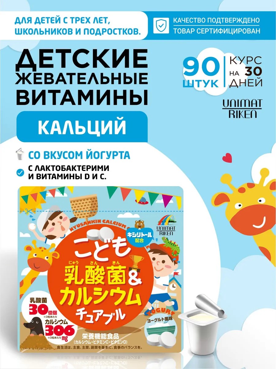 Жевательные витамины для детей от 3 лет и подростков UNIMAT RIKEN кисломолочные бактерии (три миллиарда) + кальций + витамин C + витамин D.