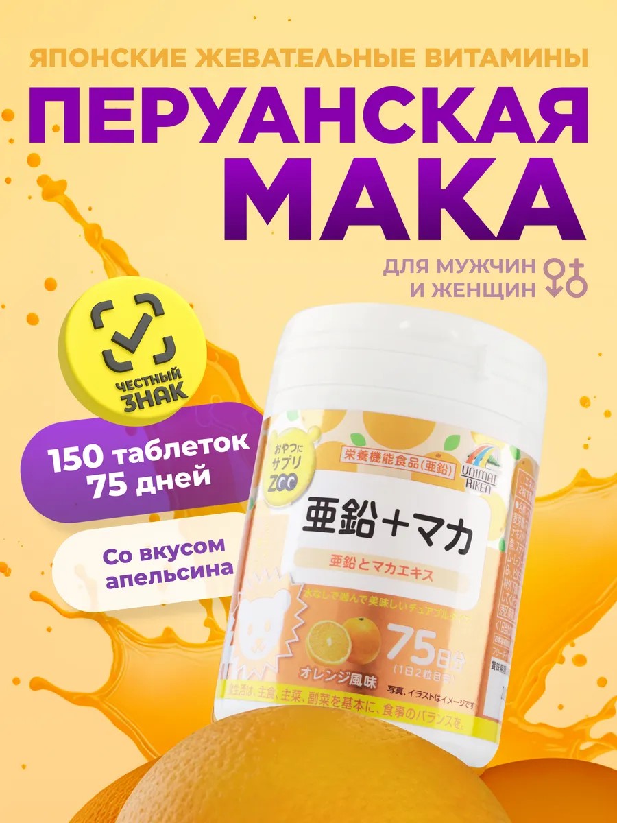 Жевательные витамины UNIMAT RIKEN ZOO Мака перуанская против синдрома хронической усталости со вкусом апельсина (150шт в упаковке).