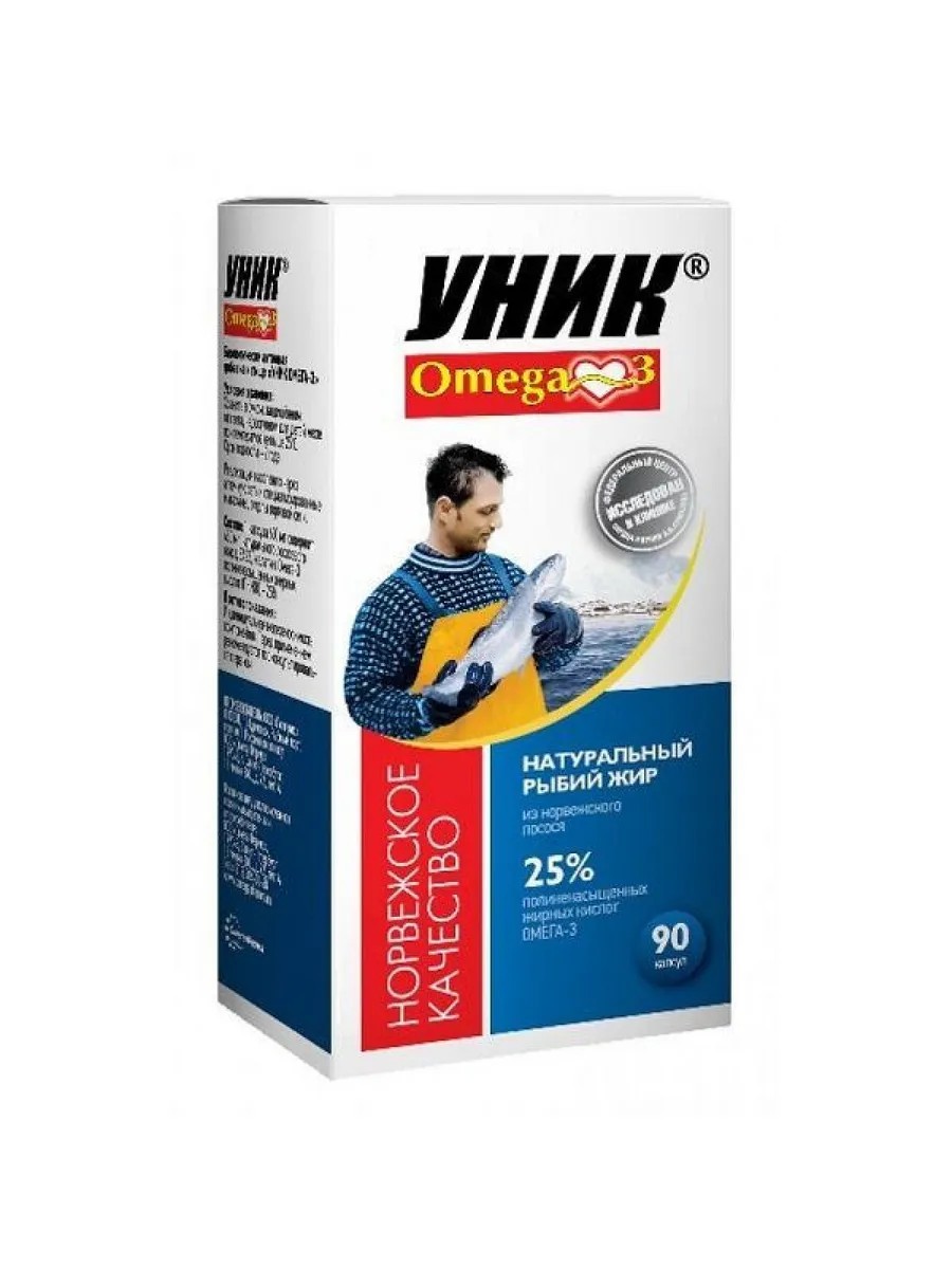Омега-3 Уник - капсулированный натуральный рыбий жир из норвежского лосося, специально изготовлен для долгой и активной жизни.Сбалансированное потребление полиненасыщенных жирных кислот является необходимым условием для безупречного функционирования иммунной, сердечно-сосудистой и нервной систем, сохранения здоровья кожи и подвижности суставов. Уник Омега-3 является превосходным источником незаменимых омега-3 жирных кислот, которые зачастую отсутствуют в рационе питания большинства людей.Уник Омега-3 содержит эйкозапентаеновую (ЭПК) и докозагексаеновую (ДГК) кислоты в уникальной фосфолипидной форме, это позволяет организму более эффективно включать их в состав клеточных мембран, в особенности клеток нервной системы.Настоящая находка для активной и здоровой жизни.Сочетается с витаминамиДля производства Уник Омега-3 используется только тушка лосося, поэтому содержание жирорастворимых витаминов в конечном продукте крайне низкое (менее 1% от РНП). Это позволяет комбинировать Уник Омега-3 с любым витаминно-минеральным комплексом.Прозрачный производственный циклВажнейшим показателем качества рыбьего жира является прослеживаемость производственного цикла продукта. Используется рыбный жир, полученный из лосося, выращенного в экологически чистом регионе Норвегии и от определенного поставщика. Это обеспечивает неизменно высокое качество конечного продукта.Источник - тушка норвежского лосося.При изготовлении не используется печень рыбы, поскольку этот орган накапливает соли тяжелых металлов, токсины и диоксины. Рыбный жир для Уник Омега-3 получают только из крупных пород рыб: лосось, тунец, форель. Этот жир ценится значительно выше, чем жир, производимый из сорных пород рыб.Без рафинирования и химической обработкиНа производстве рыбьего жира для Уник Омега-3 нет этапа рафинирования (процесс очистки, который повреждает ценнейшие двойные связи, что в свою очередь снижает эффективность конечного продукта). Поэтому "Уник Омега-3 не подвергается последующему восстановлению в виде химической обработки.