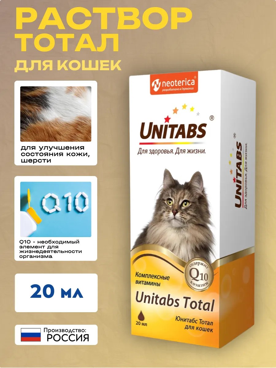 Unitabs Total is a vitamin complex for cats of all breeds, which contains coenzyme Q10 and all the necessary vitamins to improve the condition of the skin, coat, and immunity of the pet.