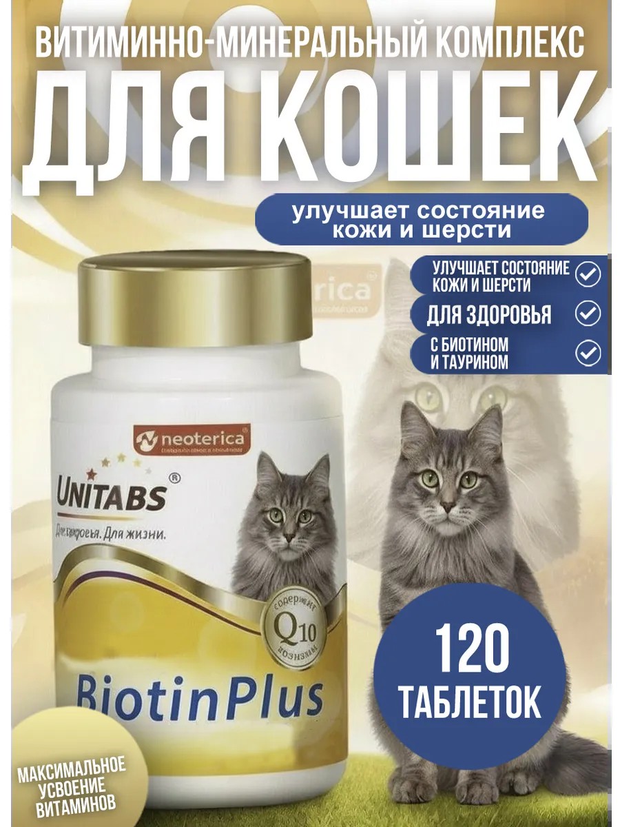 Vitamin and mineral complex for cats Unitabs BiotinPlus for skin and coat, 120 tablets. Unitabs BiotinPlus is a vitamin and mineral complex for cats, which contains coenzyme Q10 and all the necessary vitamins, macro- and microelements to improve the condition of the skin and coat. Unitabs BiotinPlus: reduces shedding; stimulates hair growth; ensures healthy skin; strengthens the immune system. Give Unitabs BiotinPlus to cats: during shedding; to improve the condition of the skin and coat; to eliminate dry and flaky skin. Unitabs BiotinPlus contains: biotin, sulfur and zinc are the building blocks of wool, stimulate its growth and prevent hair loss; vitamins B and A nourish the skin, reduce shedding and stimulate hair growth, giving it elasticity and shine; taurine is an essential amino acid for cats, necessary to maintain the health and quality of the coat. Directions for use: daily from 6 months of age One tablet per 1 kg. The course of application is not limited.