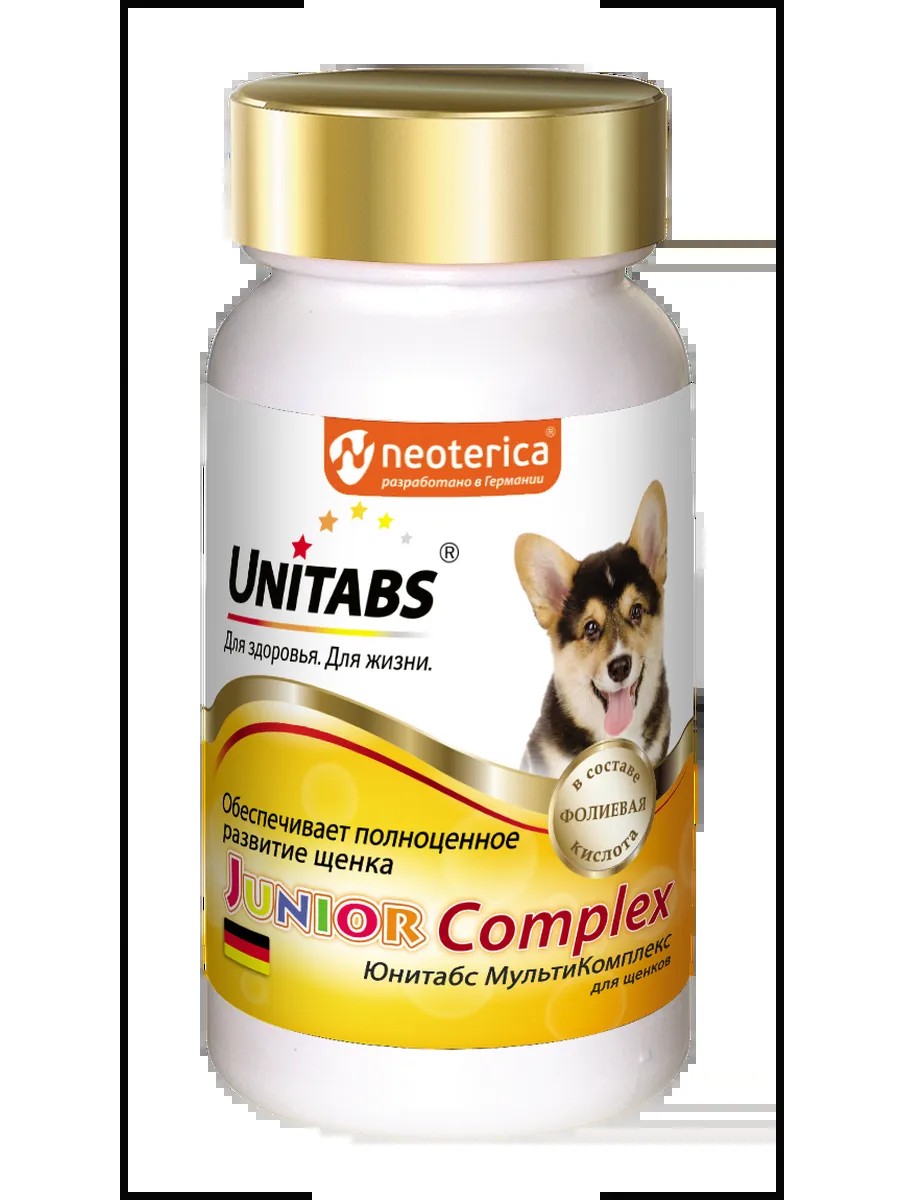 Unitabs JuniorComplex — это витаминно-минеральный комплекс для щенков, который содержит фолиевую кислоту и все необходимые витамины, макро- и микроэлементы для полноценного развития организма.