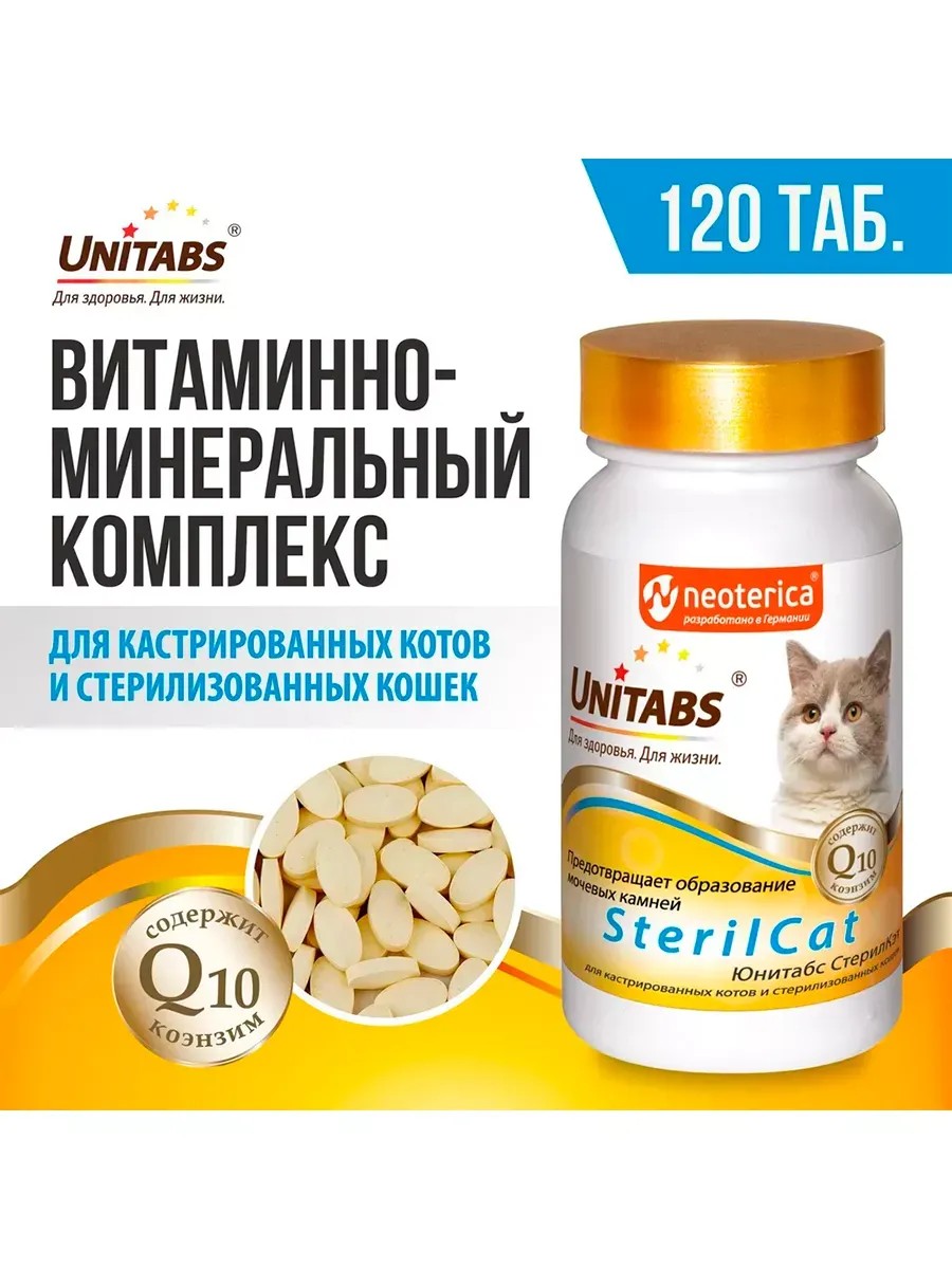 Unitabs SterilCat vitamins are specially formulated to support the health and well-being of sterilized cats. The formula, enriched with essential vitamins and minerals, helps compensate for potential deficiencies that may occur after sterilization. Regular use of Unitabs SterilCat helps maintain a healthy weight, strengthen the immune system, and improve the condition of your pet's coat and skin. These tasty tablets are easy to administer to your cat, simplifying the vitamin administration process. Unitabs SterilCat is a reliable way to care for the health and active lifestyle of your sterilized cat.