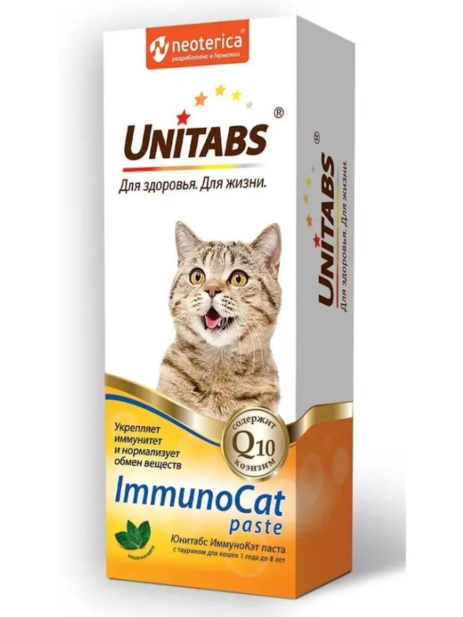 Unitabs ImmunoCat — это витаминно-минеральный комплекс для взрослых кошек всех пород, который содержит коэнзим Q10 и все необходимые витамины, макро- и микроэлементы для нормализации обмена веществ и укрепления иммунитета. Витаминная паста со вкусом кошачьей мяты придётся по душе привередливым кошкам.