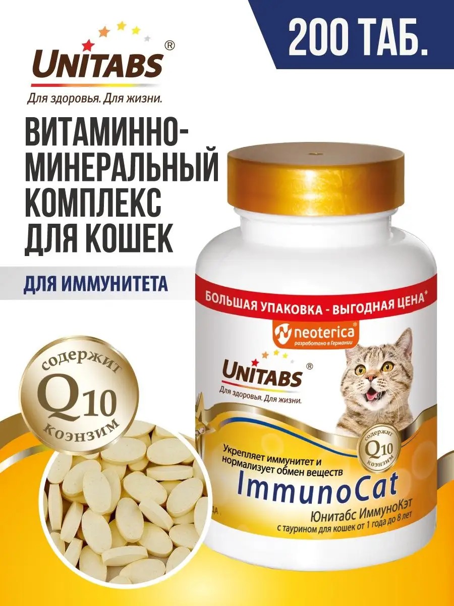 Unitabs ImmunoCat vitamins for cats are a vitamin and mineral complex for adult cats of all breeds, containing coenzyme Q10 and all the necessary vitamins, macro- and microelements to normalize metabolism and strengthen the immune system. The milky taste and smell of these vitamins will appeal to even the pickiest cats. Coenzyme Q10 is a vitamin-like substance that is an essential element for the body's vital functions. Unitabs ImmunoCat vitamins for adult cats contain 13 elements for comprehensive action. Restores the balance of vitamins, macro- and microelements. Normalizes metabolism. Strengthens the immune system. Reduces the risk of disease. Add Unitabs ImmunoCat tablets to the diet of cats for adult cats: From 1 year to 8 years. To enrich the diet when feeding natural feeding. To balance the diet when using prepared food. For autumn-spring hypovitaminosis. The active ingredients of this pet tablet are: Coenzyme Q10 and taurine. Vitamins B and PP. Magnesium, copper, zinc, iodine, and manganese. Unitabs ImmunoCat vitamins are balanced to meet the daily needs of cats aged 1 to 8 years in vitamins, macro-, and microelements. B vitamins enhance antibody production. Macro- (Mg) and microelements (Cu, Zn, Mn, J) help strengthen the immune system and participate in metabolism. Coenzyme Q10 is a catalyst and antioxidant: it neutralizes harmful free radicals, helps slow the aging process, prevents cardiovascular diseases, strengthens the immune system, and protects gums and teeth. Taurine is an essential amino acid necessary for maintaining coat quality and the integrity of the retina, as well as for the functioning of the cardiovascular, digestive, and nervous systems. Unitabs ImmunoCat for adult cats: 1 tablet per 1 kg. 200 tablets per bottle. Daily. Unlimited course of treatment. Formulated by Neoterica (Germany).