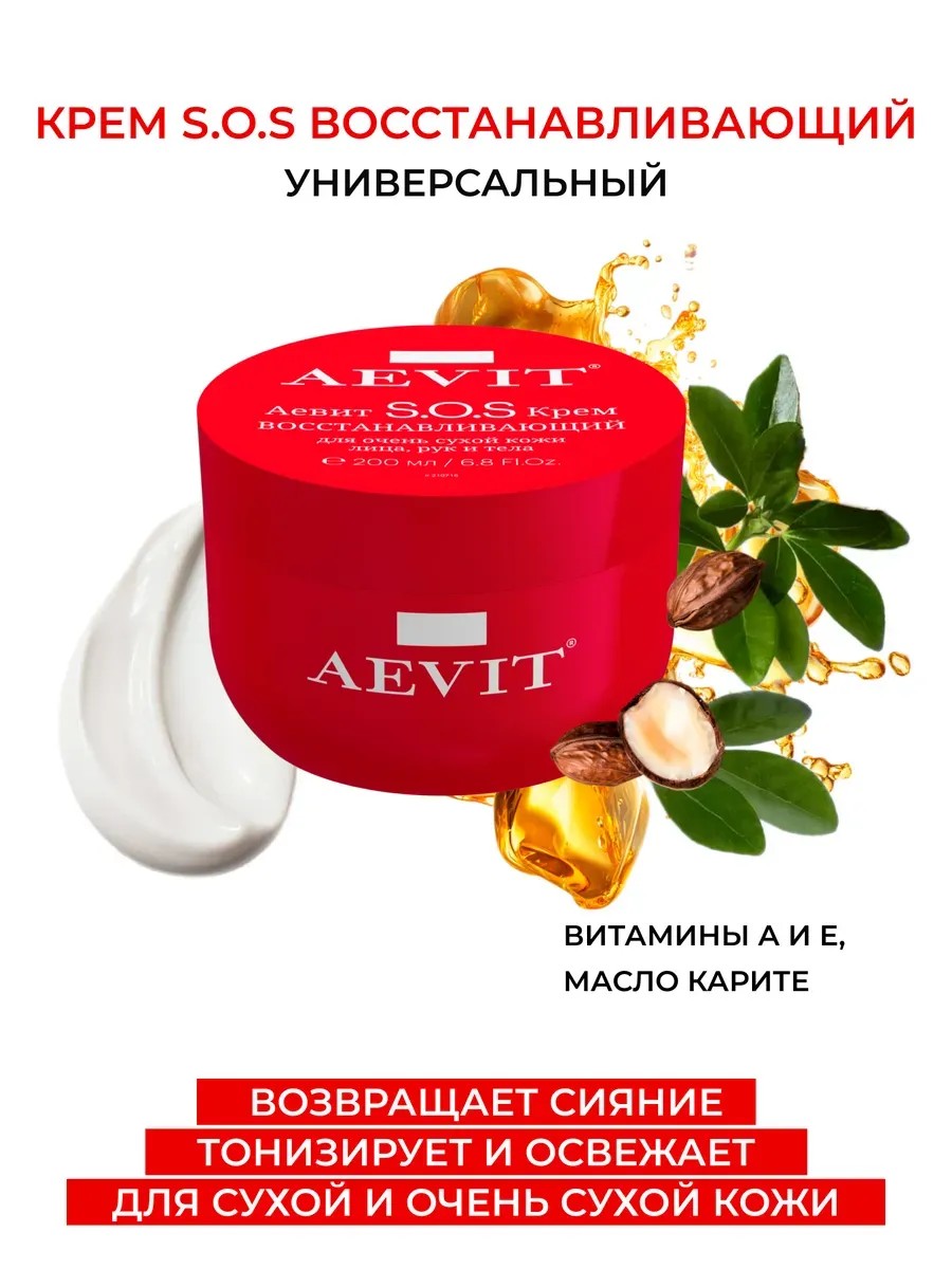 AEVIT Крем SOS универсальный увлажняющий для лица, рук и тела 200 мл. Крем АЕВИТ СОС для очень сухой кожи лица, рук и тела глубоко увлажняет и питает кожу, насыщая витаминами, восстанавливает барьерные функции кожи, предотвращая потерю влаги, успокаивает, избавляет от ощущения стянутости. Крем быстро впитывается, не оставляя на коже жирной пленки. Витамины А и Е эффективно увлажняют, ускоряют процессы регенерации кожи, устраняют сухость, раздражение и шелушение, защищают от неблагоприятного воздействия окружающей среды, обеспечивают антиоксидантную защиту. Масло карите питает и увлажняет, а так же смягчает, успокаивает, защищает кожу, способствует ее восстановлению. Способ применения: наносить на кожу лица, рук и тела легкими массирующими движениями. Использовать можно так часто, как это необходимо.