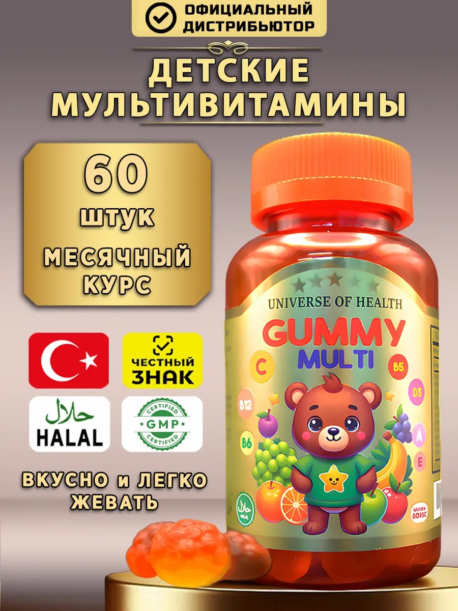 Universe of Health Gummy Multi - Вкусные и полезные Витамины для ваших детей! Подарите вашему ребенку крепкое здоровье и отличное настроение с нашими жевательными мультивитаминами Universe of Health Gummy Multi! Эти вкусные и полезные мармеладки, произведенные в Турции, разработаны специально для детей, чтобы обеспечить их организм всеми необходимыми витаминами и минералами для гармоничного роста и развития. Витамины для детей Universe of Health Gummy Multi - это: Яркий вкус и забавные формы: Ваши дети будут в восторге от фруктового вкуса и милых форм мармеладок, которые превратят прием витаминов в настоящее удовольствие! Комплексная поддержка иммунитета: Сбалансированный состав витаминов и минералов укрепит иммунную систему вашего ребенка и поможет ему оставаться здоровым круглый год. Здоровый рост и развитие: Наша формула способствует правильному росту костей, зубов и мышц, а также поддерживает развитие мозга и нервной системы. Удобство приема: Больше не нужно заставлять ребенка глотать таблетки! Жевательные витамины легко усваиваются и подходят даже самым маленьким. Высокое качество из Турции: Произведено в соответствии с международными стандартами качества и безопасности. С Universe of Health Gummy Multi ваши дети получают все необходимое для здоровья и энергии! Подарите им яркую жизнь, полную сил и радости!