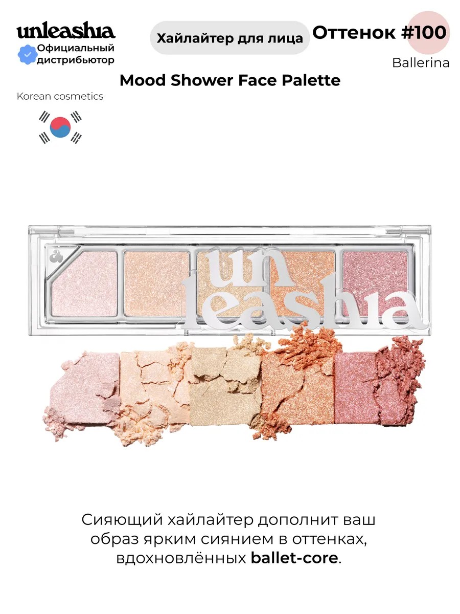 Палетка сияющих хайлайтеров Unleashia Mood Shower Face Palette для многофункционального использования состоит из 5 оттенков.