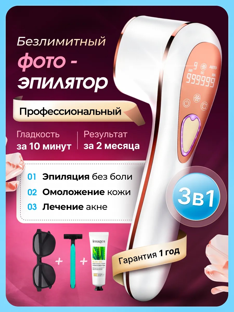| Комплектация | фотоэпилятор 1 шт; зарядное устройство 1 шт; Инструкция 1 шт; очки 1 шт; бритва 1 шт; увлажняющий гель 1 шт |