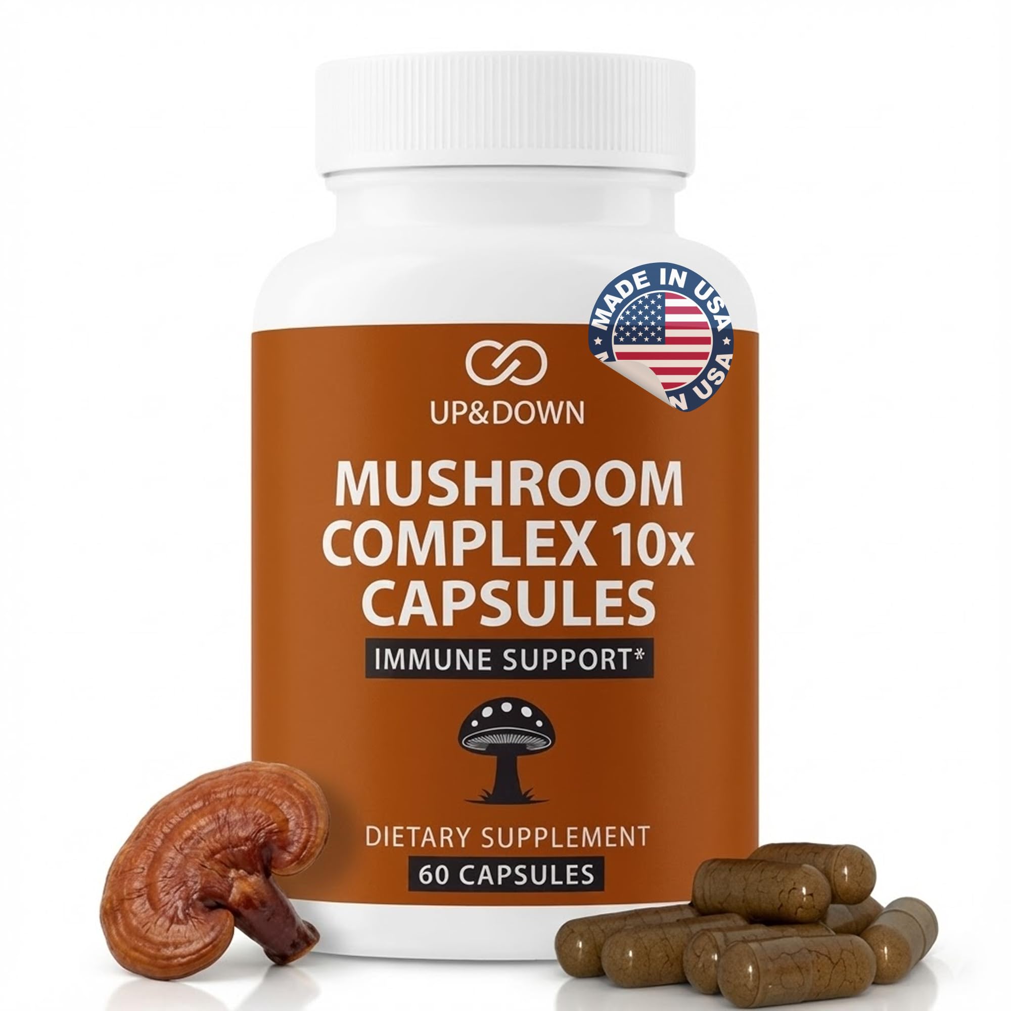 MADE IN THE USA, PREMIUM QUALITY – Up Down Mushroom Complex 10X is manufactured in the USA under strict cGMP standards. Our formula is vegan, gluten-free, and non-GMO, ensuring the highest level of purity and safety. Each bottle contains 60 easy-to-swallow capsules, providing a full month of premium wellness support. NATURAL ENERGY STRESS BALANCE – Cordyceps mushrooms help improve stamina and physical endurance, while Reishi is traditionally used to reduce stress and promote relaxation. Together, they provide a natural way to maintain balance between energy and calm, so you can perform at your best. COGNITIVE PERFORMANCE MENTAL CLARITY – Lion's Mane and Reishi are known for their ability to support memory, concentration, and mental clarity. Combined with Cordyceps for natural energy, this formula is perfect for those who want sharper focus, improved productivity, and calm under stress. IMMUNE DEFENSE WELLNESS SUPPORT – Our Mushroom Complex 10X is packed with antioxidants and bioactive compounds that strengthen the immune system. Turkey Tail, Shiitake, and Maitake mushrooms have long been valued for their immune-boosting properties, helping your body stay strong against daily challenges. 1300mg POTENT MUSHROOM COMPLEX – Each serving delivers a powerful 1300mg dose of 10 carefully selected mushrooms, including Reishi, Lion's Mane, Cordyceps, Chaga, and Turkey Tail. This high-strength formula is designed to provide maximum support for immunity, focus, and overall vitality.