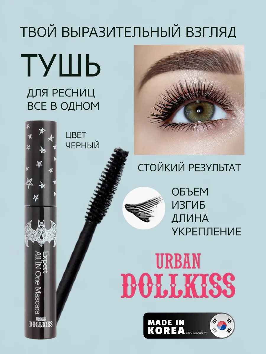 Восхитительная черная тушь все в одном от корейского бренда Baviphat подарит взгляду выразительность и манящую глубину. Универсальная тушь подарит вашим ресничкам объём, длину и красивый изгиб. В состав продукта входят проверенные растительные компоненты, поэтому он не вызывает покраснения глаз и аллергических реакций. Urban Dollkiss Black Devil Expert All in One Mascara – это удивительная тушь, которая отлично подкручивает реснички. Прочный полимер туши уркепляет слабые ресницы, создает объем и удлиняет, а также образует трехмерный завиток для ресниц. Сохраняет свою форму в течении всего дня. Эта удлиняющая и подкручивающая тушь обладает непревзойдённой текстурой и наносится легко, мгновенно придаёт ресницам максимальную длину и объем. Тушь для ресниц удлиняющая и объёмная обладает секретом, заключающимся в применении качественных компонентов, которые бережно заботятся о здоровье ваших ресниц. Инновационная декоративная косметика для создания идеального макияжа глаз. Имеет добротную кисточку с плотным ворсом. Кисть быстро и равномерно прокрашивает даже самые тоненькие реснички. При регулярном применении туши, ресницы укрепляются и становятся длиннее. Средство имеет мягкую консистенцию, поэтому не утяжеляет ресницы. Корейская тушь хорошо наносится, не склеивает ресницы и не оставляет комочков, не осыпается и не размазывается в течение дня, и при этом легко смывается теплой водой. Кисть равномерно прокрашивает ресницы, а специальные полимеры обеспечивают стойкость средства и позволяют зафиксировать красивый изгиб ресниц. Качественная тушь для ресниц идеально подойдёт как для любого повседневного образа, так и для особенных моментов. Для удаления туши используйте привычное средство для демакияжа. Тушь для ресниц чёрная объем и удлинение превратит его в настоящее произведение искусства.