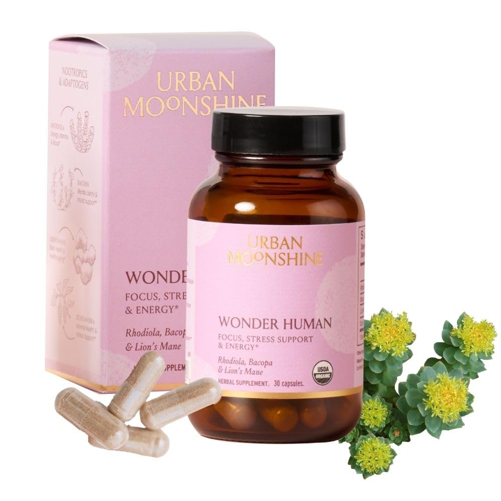 Urban Moonshine Wonder Human - Herbal Supplement for Focus Energy & Stress Support - Brain Support with Rhodiola Bacopa & Lion s Mane - Certified Organic Gluten-Free & Vegan - 30 Capsules