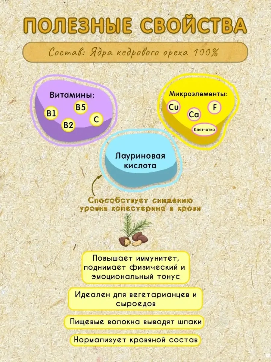 Кедровый орех не зря называют сибирским золотом. Все вещества в комплексе поднимают и физический и эмоциональный тонус. Особенно полезен белок - он идеально сбалансирован и близок по составу с белком тканей человека, что очень важно для вегетарианцев. Калий предотвращает отёки, натрий улучшает умственные способности и концентрацию. Пищевые волокна выводят шлаки. Богатый состав аминокислот и минералов поможет при борьбе с аллергией. Благодаря кедру нормализуется кровяной состав. Чтобы дать поступить всему перечисленному в организм, не потеряв ничего на полпути, рекомендуется именно кедровая паста, потому что в таком виде вещества усваиваются гораздо лучше. Это не просто продукт, это кульминация идеалов здорового питания, объединяющая в себе все принципы правильного питания и диетических принципов. Сделанный из тщательно отобранных и очищенных кедровых орехов, этот продукт является настоящим кладезем питательных веществ и клетчатки, что делает его идеальным выбором для тех, кто следит за своим здоровьем и фигурой. Кедровые орехи, используемые для урбеча, представляют собой высококачественную ореховую смесь, обеспечивающую организм необходимыми жирными кислотами, белками и микроэлементами. Этот продукт попадает в категории веганских и вегетарианских продуктов, а также кето продуктов, благодаря своему низкому содержанию углеводов и отсутствию сахара, что делает его подходящим для различных типов диет. Урбеч из кедровых орехов без добавления сахара способствует улучшению обмена веществ и насыщает организм, минимизируя чувство голода. Это делает его отличным выбором для ПП сладостей, предлагая альтернативу традиционным сладким, но при этом сохраняя вкусовые качества. Урбеч не содержит глютен, что делает его безопасным выбором для людей с непереносимостью глютена или для тех, кто предпочитает безглютеновые продукты. Его употребление способствует улучшению пищеварения и обогащает рацион необходимыми витаминами и минералами. Рекомендуется включать в свой рацион утром, добавляя его в кашу или йогурт для заряда энергии на весь день. Также его можно использовать в качестве ингредиента для смузи, что позволит увеличить питательную ценность напитка. Для тех, кто предпочитает полезные перекусы, урбеч может стать основой для энергетических батончиков без добавления сахара. Употребление урбеча из кедровых орехов очищенных в количестве 1 кг позволяет долгое время наслаждаться всеми преимуществами этого продукта, делая его экономичным вариантом для поддержания здорового образа жизни. Он станет отличным дополнением к диете каждого, кто стремится к правильному питанию, учитывая его многочисленные полезные свойства и универсальность в кулинарном использовании. Это не только вкусный, но и крайне полезный продукт, способный удовлетворить потребности любого, кто стремится к здоровому образу жизни и правильному питанию. Включение его в свой рацион поможет обеспечить организм важнейшими питательными веществами, поддерживая при этом идеальный баланс вкуса и пользы.