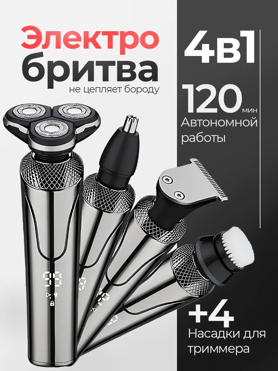 Электрическая бритва 4в1 - с набором насадок для разных функций: быстрого процесса комфортного бритья волос на лице мужчин, шейвер для щетины, триммер для удаления волосков в носу и ушах, щетка для очистки пор, а также триммер для стрижки бороды и усов с 4-мя насадками (3/6/9/12 мм). Электробритва оснащена роторной плавающей головкой, обеспечивая адаптацию к контурам подбородка и достигая максимального эффекта. Электронный дисплей на корпусе показывает заряд батареи. Встроенный аккумулятор долго держит зарядку до 120 минут. Легкий и эргономичный корпус позволяет обеспечить безопасное сухое и влажное бритье, даже в труднодоступных зонах.
